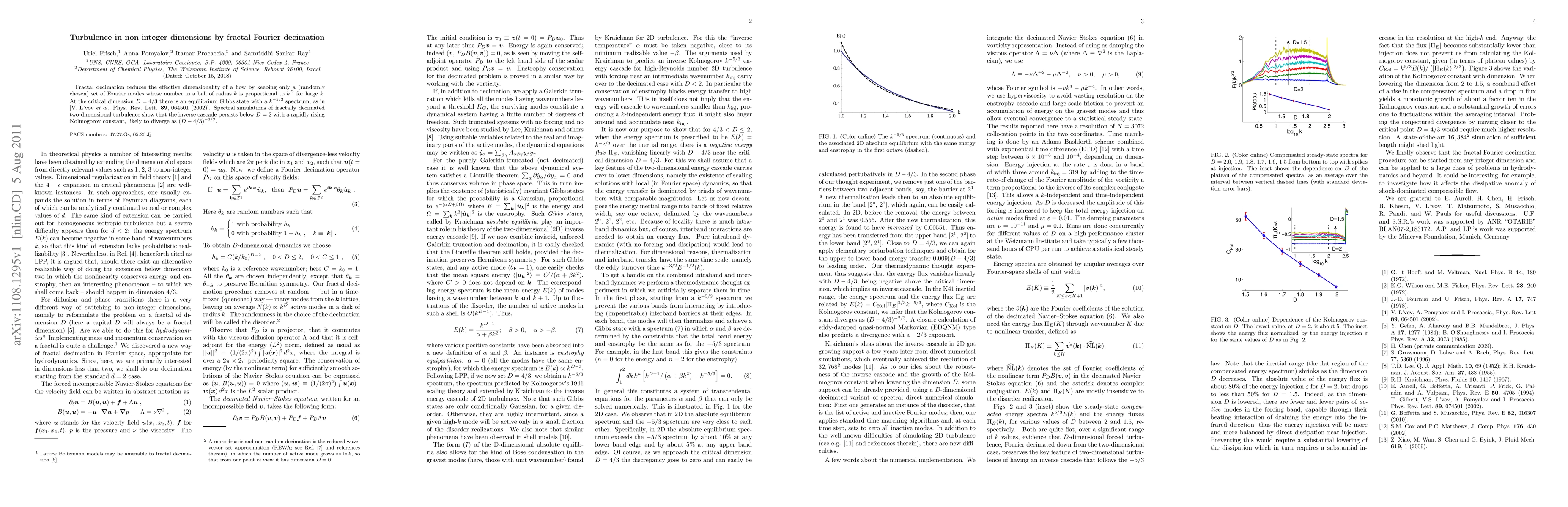 Fractal decimation reduces the effective dimensionality of a flow by keeping only a (randomly chosen) set of Fourier modes whose number in a ball of radius $k$ is proportional to $k^D$ for large $k$. At the critical dimension D=4/3 there is an equilibrium Gibbs state with a $k^{-5/3}$ spectrum, as in [V. L'vov {\it et al.}, Phys. Rev. Lett. {\bf 89}, 064501 (2002)]. Spectral simulations of fractally decimated two-dimensional turbulence show that the inverse cascade persists below D=2 with a rapidly rising Kolmogorov constant, likely to diverge as $(D-4/3)^{-2/3}$.