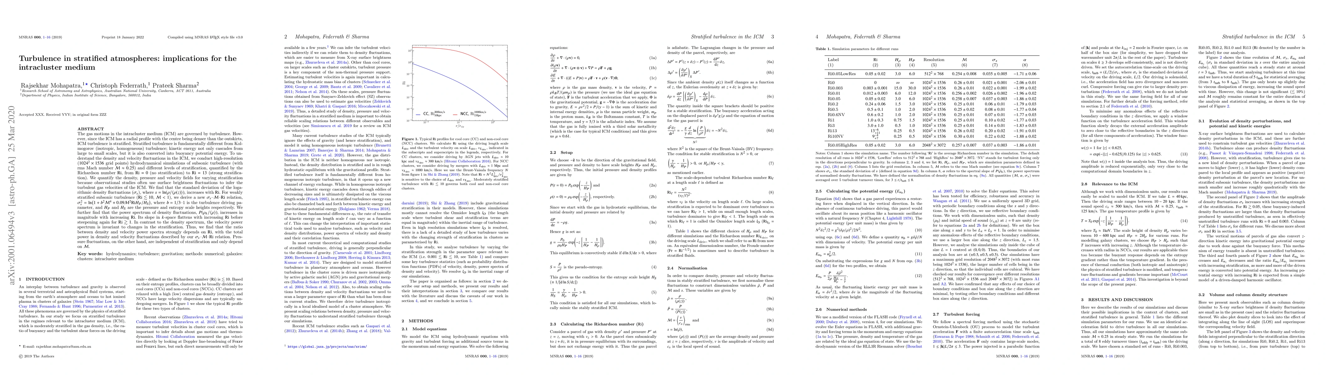 This paper investigates stratified turbulence in the intracluster medium (ICM) through high-resolution hydrodynamical simulations, revealing that density fluctuations increase with stratification level, while velocity fluctuations remain constant. The study derives a new relation for density fluctuation variance and shows that density power spectra increase with stratification, contrasting with invariant velocity power spectra.