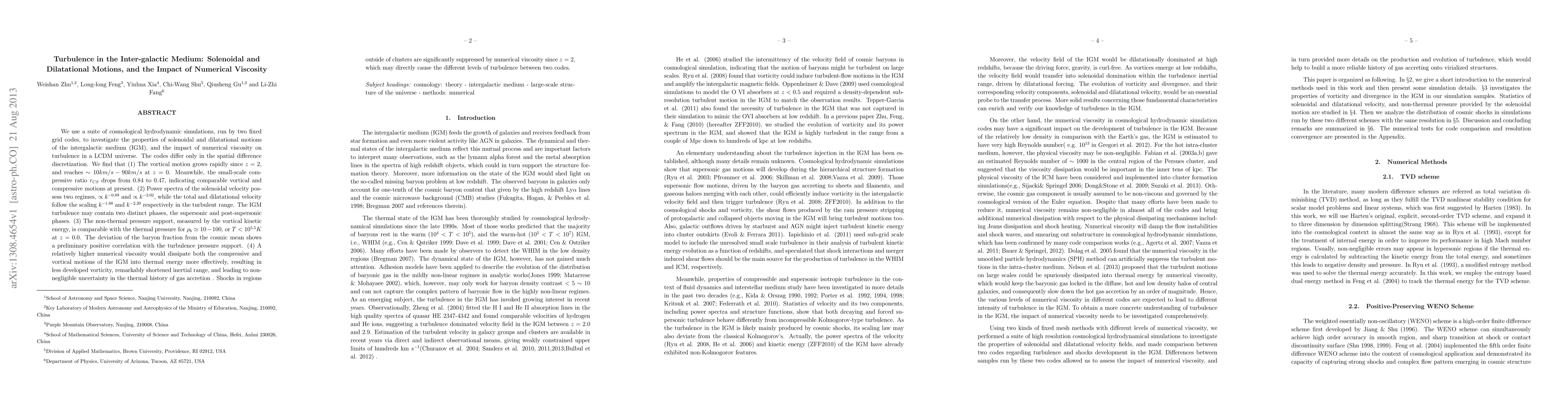 We use a suite of cosmological hydrodynamic simulations, run by two fixed grid codes, to investigate the properties of solenoidal and dilatational motions of the intergalactic medium (IGM), and the impact of numerical viscosity on turbulence in a LCDM universe. The codes differ only in the spatial difference discretization. We find that (1) The vortical motion grows rapidly since $z=2$, and reaches $\sim 10 km/s -90 km/s$ at $z=0$. Meanwhile, the small-scale compressive ratio $r_{CS}$ drops from 0.84 to 0.47, indicating comparable vortical and compressive motions at present. (2) Power spectra of the solenoidal velocity possess two regimes, $\propto k^{-0.89}$ and $\propto k^{-2.02}$, while the total and dilatational velocity follow the scaling $k^{-1.88}$ and $k^{-2.20}$ respectively in the turbulent range. The IGM turbulence may contain two distinct phases, the supersonic and post-supersonic phases. (3) The non-thermal pressure support, measured by the vortical kinetic energy, is comparable with the thermal pressure for $\rho_b \simeq 10-100$, or $T <10^{5.5} K$ at $z=0.0$. The deviation of the baryon fraction from the cosmic mean shows a preliminary positive correlation with the turbulence pressure support. (4) A relatively higher numerical viscosity would dissipate both the compressive and vortical motions of the IGM into thermal energy more effectively, resulting in less developed vorticity, remarkably shortened inertial range, and leading to non-negligible uncertainty in the thermal history of gas accretion. Shocks in regions outside of clusters are significantly suppressed by numerical viscosity since $z=2$, which may directly cause the different levels of turbulence between two codes.