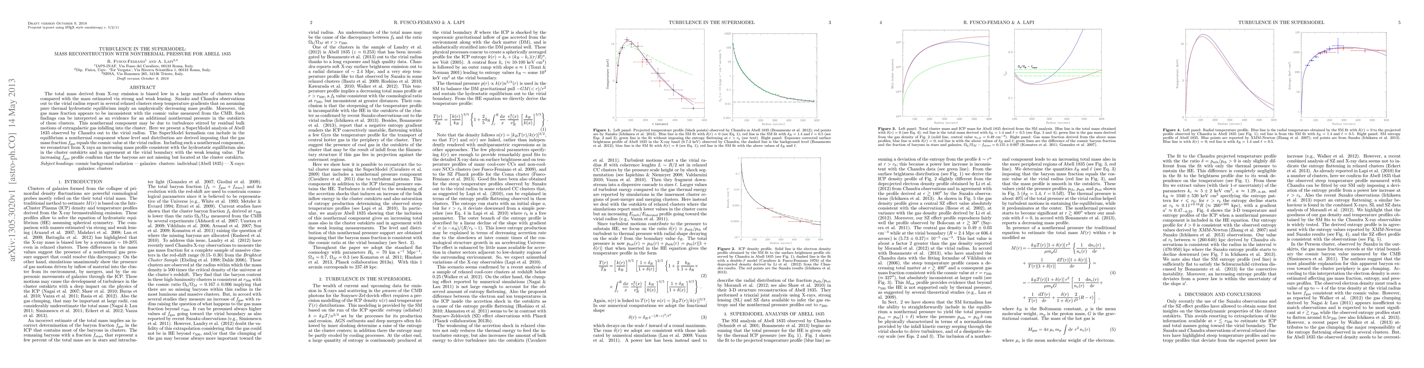 The total mass derived from X-ray emission is biased low in a large number of clusters when compared with the mass estimated via strong and weak lensing. Suzaku and Chandra observations out to the virial radius report in several relaxed clusters steep temperature gradients that on assuming pure thermal hydrostatic equilibrium imply an unphysically decreasing mass profile. Moreover, the gas mass fraction appears to be inconsistent with the cosmic value measured from the CMB. Such findings can be interpreted as an evidence for an additional nonthermal pressure in the outskirts of these clusters. This nonthermal component may be due to turbulence stirred by residual bulk motions of extragalactic gas infalling into the cluster. Here we present a SuperModel analysis of Abell 1835 observed by Chandra out to the virial radius. The SuperModel formalism can include in the equilibrium a nonthermal component whose level and distribution are derived imposing that the gas mass fraction f_{gas} equals the cosmic value at the virial radius. Including such a nonthermal component, we reconstruct from X rays an increasing mass profile consistent with the hydrostatic equilibrium also in the cluster outskirts and in agreement at the virial boundary with the weak lensing value. The increasing f_{gas} profile confirms that the baryons are not missing but located at the cluster outskirts.