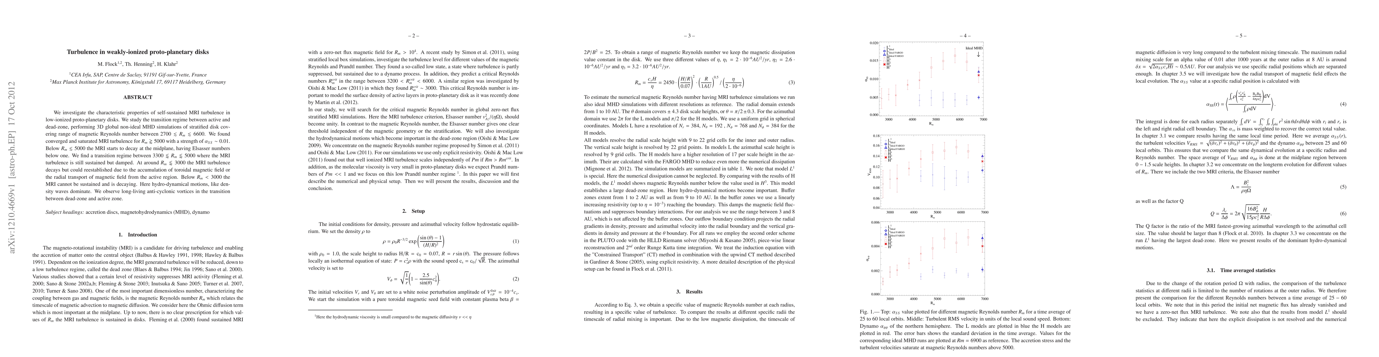 This study explores MRI turbulence in weakly-ionized proto-planetary disks through 3D global non-ideal MHD simulations, revealing sustained MRI turbulence for magnetic Reynolds numbers above 5000, while below this threshold, turbulence decays, with a transition regime between 3300 and 5000 where damping occurs. Hydro-dynamical motions dominate below 3000, and anti-cyclonic vortices are observed in the transition between dead-zone and active zones.