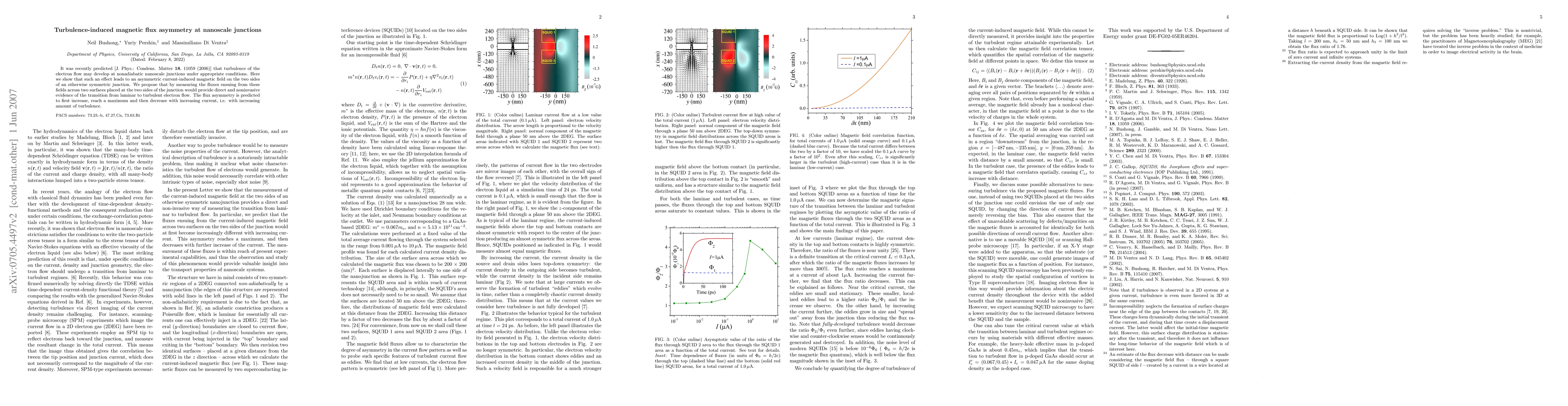 It was recently predicted [J. Phys.: Condens. Matter 18, 11059 (2006)] that turbulence of the electron flow may develop at nonadiabatic nanoscale junctions under appropriate conditions. Here we show that such an effect leads to an asymmetric current-induced magnetic field on the two sides of an otherwise symmetric junction. We propose that by measuring the fluxes ensuing from these fields across two surfaces placed at the two sides of the junction would provide direct and noninvasive evidence of the transition from laminar to turbulent electron flow. The flux asymmetry is predicted to first increase, reach a maximum and then decrease with increasing current, i.e. with increasing amount of turbulence.