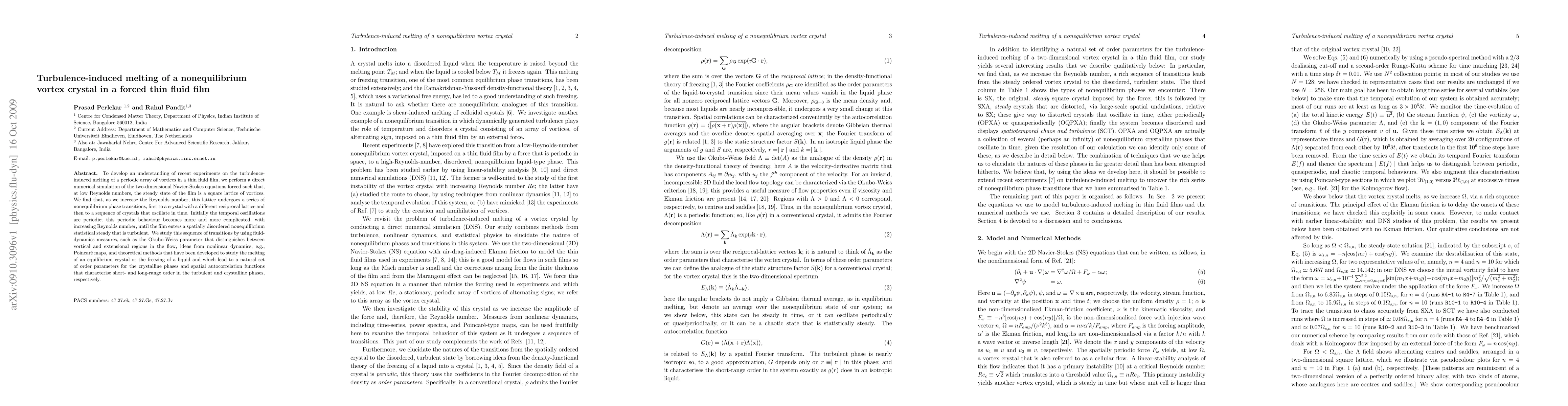 To develop an understanding of recent experiments on the turbulence-induced melting of a periodic array of vortices in a thin fluid film, we perform a direct numerical simulation of the two-dimensional Navier-Stokes equations forced such that, at low Reynolds numbers, the steady state of the film is a square lattice of vortices. We find that, as we increase the Reynolds number, this lattice undergoes a series of nonequilibrium phase transitions, first to a crystal with a different reciprocal lattice and then to a sequence of crystals that oscillate in time. Initially the temporal oscillations are periodic; this periodic behaviour becomes more and more complicated, with increasing Reynolds number, until the film enters a spatially disordered nonequilibrium statistical steady that is turbulent. We study this sequence of transitions by using fluid-dynamics measures, such as the Okubo-Weiss parameter that distinguishes between vortical and extensional regions in the flow, ideas from nonlinear dynamics, e.g., \Poincare maps, and theoretical methods that have been developed to study the melting of an equilibrium crystal or the freezing of a liquid and which lead to a natural set of order parameters for the crystalline phases and spatial autocorrelation functions that characterise short- and long-range order in the turbulent and crystalline phases, respectively.