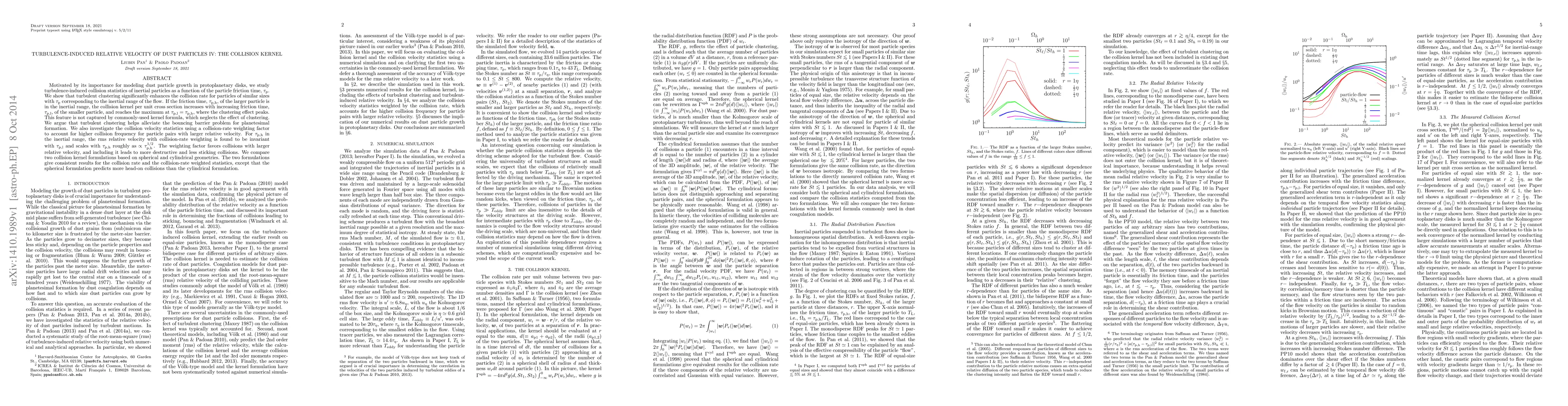 This paper investigates turbulence-induced collision statistics of dust particles in protoplanetary disks, focusing on how turbulent clustering enhances collision rates for particles with similar sizes. It finds that the collision kernel increases with the smaller particle's friction time and peaks when both particles' friction times match, highlighting the importance of clustering effects not captured by standard kernel formulas.