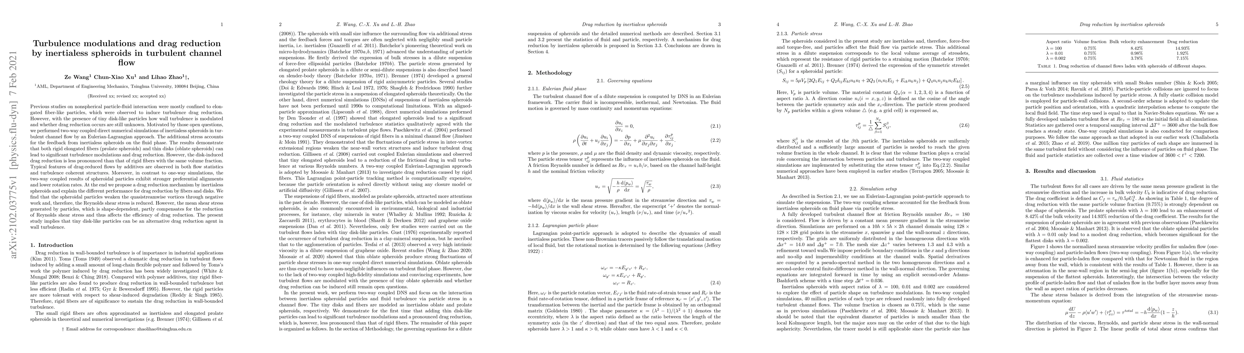 This study investigates turbulence modulation and drag reduction in turbulent channel flow by inertialess spheroids using two-way coupled direct numerical simulations. Both elongated fibers and thin disks (prolate and oblate spheroids, respectively) significantly modulate turbulence and reduce drag, though disk-induced reduction is less effective. The research proposes a mechanism where spheroids weaken quasistreamwise vortices, leading to reduced Reynolds shear stress and drag, but mean shear stress from particles affects overall drag reduction efficiency.