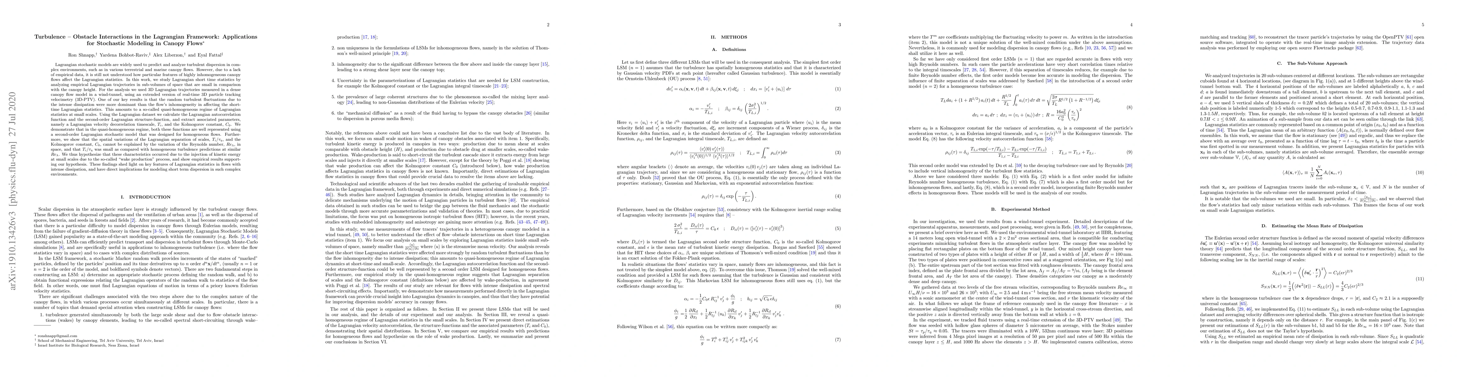This paper investigates Lagrangian short time statistics in turbulent canopy flows using empirical 3D Lagrangian trajectories from a wind-tunnel model. It finds that random turbulent fluctuations dominate over flow inhomogeneity, leading to a quasi-homogeneous regime at small scales, and supports this with calculated Lagrangian autocorrelation and structure-function parameters.