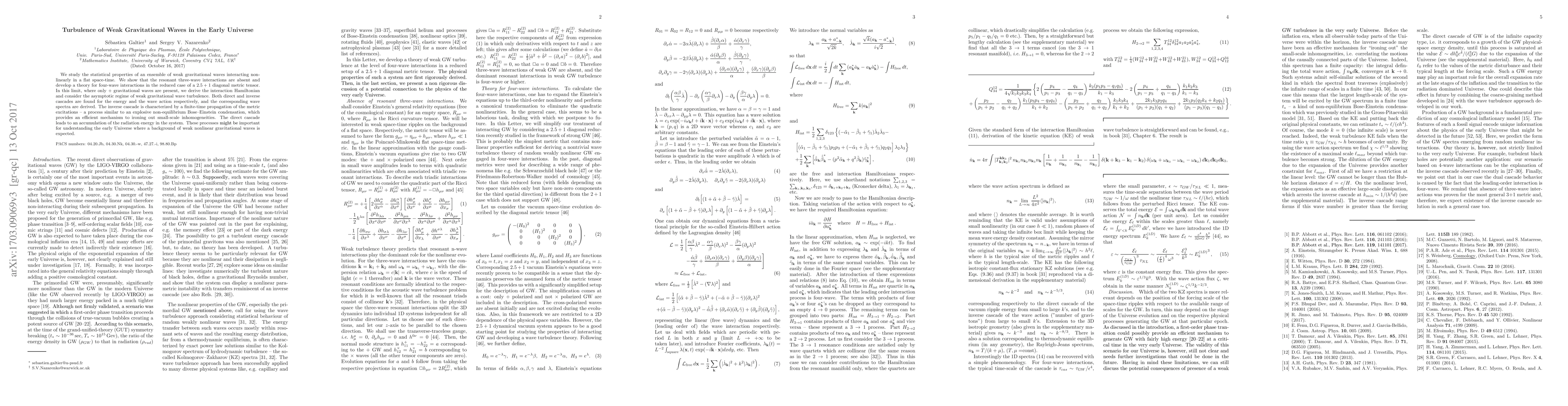 This paper investigates the nonlinear interactions of weak gravitational waves in the early universe, demonstrating the absence of resonant three-wave interactions and developing a theory for four-wave interactions. The study reveals both direct and inverse cascades in the turbulence, with implications for understanding the background of gravitational waves in the early universe.