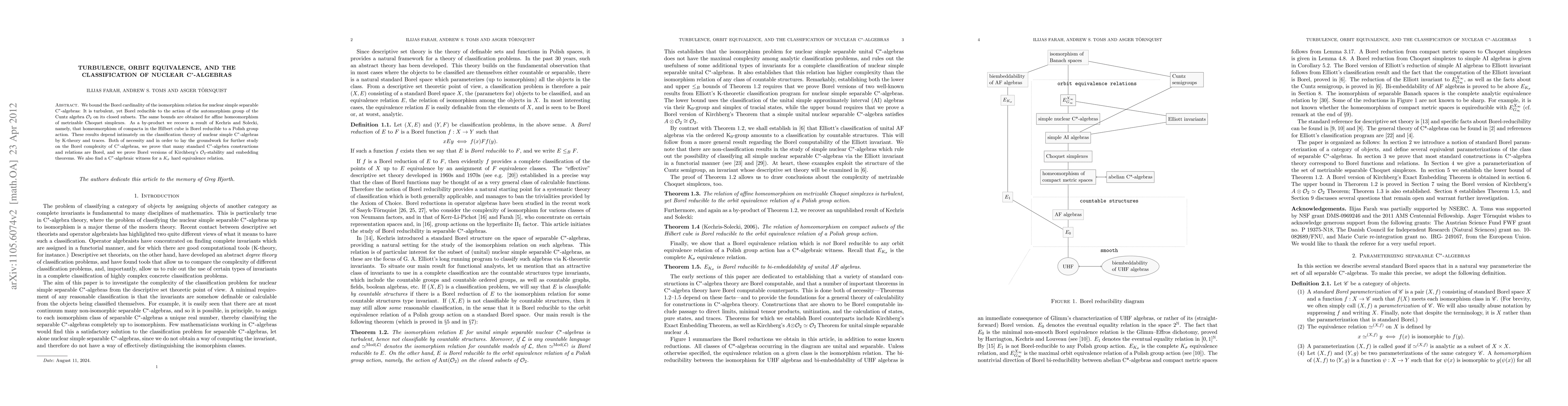 We bound the Borel cardinality of the isomorphism relation for nuclear simple separable C*-algebras: It is turbulent, yet Borel reducible to the action of the automorphism group of the Cuntz algebra O_2 on its closed subsets. The same bounds are obtained for affine homeomorphism of metrizable Choquet simplexes. As a by-product we recover a result of Kechris and Solecki, namely, that homeomorphism of compacta in the Hilbert cube is Borel reducible to a Polish group action. These results depend intimately on the classification theory of nuclear simple C*-algebras by K-theory and traces. Both of necessity and in order to lay the groundwork for further study on the Borel complexity of C*-algebras, we prove that many standard C*-algebra constructions and relations are Borel, and we prove Borel versions of Kirchberg's O_2-stability and embedding theorems. We also find a C*-algebraic witness for a K_\sigma hard equivalence relation.