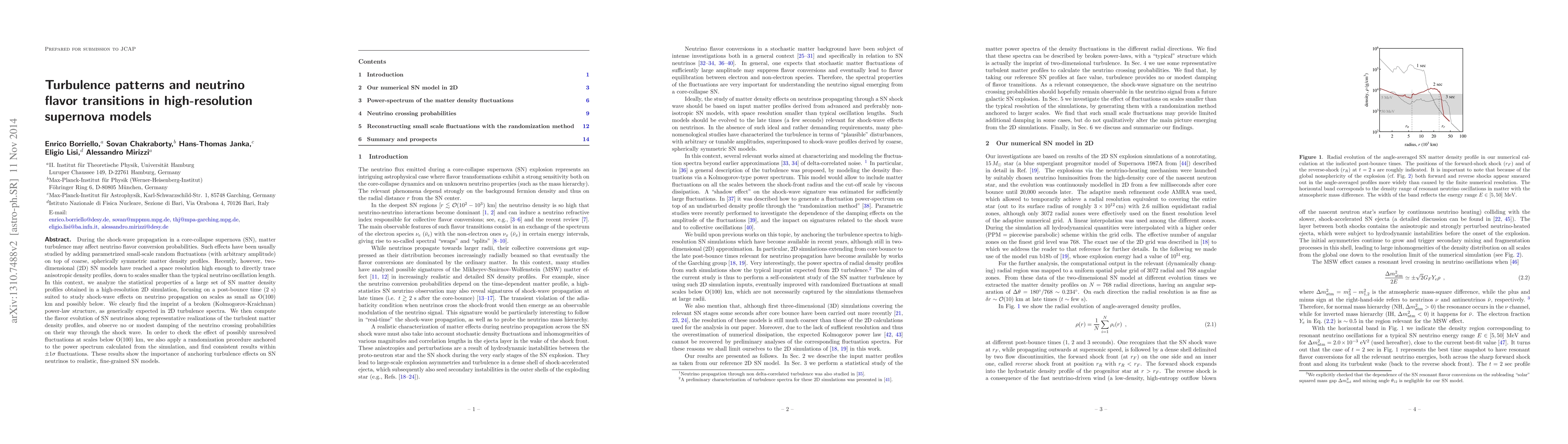 During the shock-wave propagation in a core-collapse supernova (SN), matter turbulence may affect neutrino flavor conversion probabilities. Such effects have been usually studied by adding parametrized small-scale random fluctuations (with arbitrary amplitude) on top of coarse, spherically symmetric matter density profiles. Recently, however, two-dimensional (2D) SN models have reached a space resolution high enough to directly trace anisotropic density profiles, down to scales smaller than the typical neutrino oscillation length. In this context, we analyze the statistical properties of a large set of SN matter density profiles obtained in a high-resolution 2D simulation, focusing on a post-bounce time (2 s) suited to study shock-wave effects on neutrino propagation on scales as small as O(100) km and possibly below. We clearly find the imprint of a broken (Kolmogorov-Kraichnan) power-law structure, as generically expected in 2D turbulence spectra. We then compute the flavor evolution of SN neutrinos along representative realizations of the turbulent matter density profiles, and observe no or modest damping of the neutrino crossing probabilities on their way through the shock wave. In order to check the effect of possibly unresolved fluctuations at scales below O(100) km, we also apply a randomization procedure anchored to the power spectrum calculated from the simulation, and find consistent results within \pm 1 sigma fluctuations. These results show the importance of anchoring turbulence effects on SN neutrinos to realistic, fine-grained SN models.