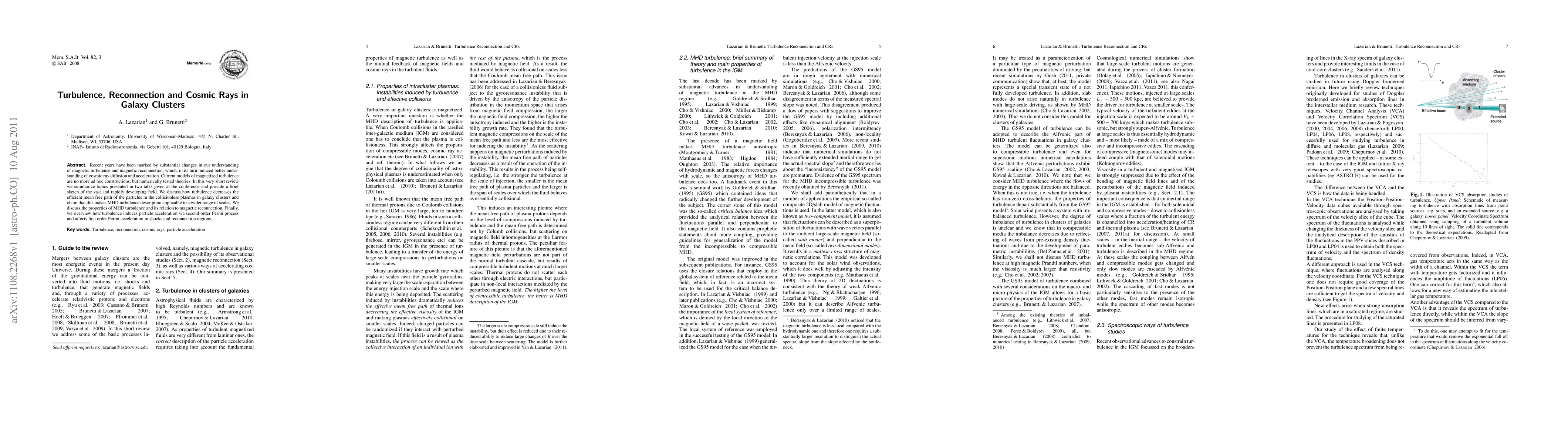 Recent years have been marked by substantial changes in our understanding of magnetic turbulence and magnetic reconnection, which, in its turn induced better understanding of cosmic ray diffusion and acceleration. Current models of magnetized turbulence are no more ad hoc constructions, but numerically tested theories. In this very short review we summarize topics presented in two talks given at the conference and provide a brief sketch of the vast and rapidly developing field. We discuss how turbulence decreases the efficient mean free path of the particles in the collisionless plasmas in galaxy clusters and claim that this makes MHD turbulence description applicable to a wider range of scales. We discuss the properties of MHD turbulence and its relation to magnetic reconnection. Finally, we overview how turbulence induces particle acceleration via second order Fermi process and affects first order Fermi acceleration in shocks and reconnection regions.
