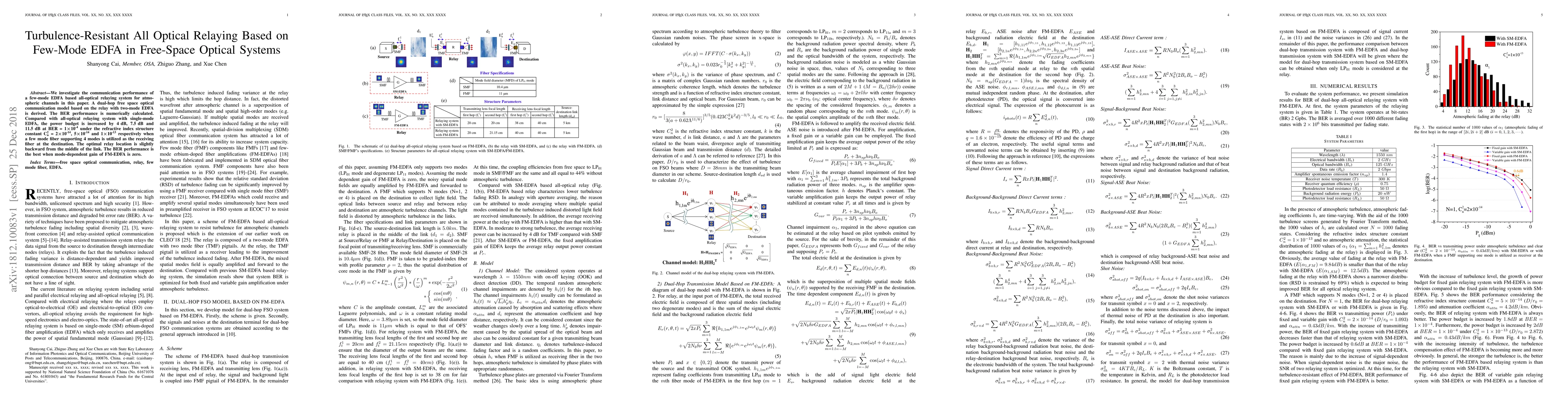 We investigate the communication performance of a few-mode EDFA based all-optical relaying system for atmospheric channels in this paper. A dual-hop free space optical communication model based on the relay with two-mode EDFA is derived. The BER performance is numerically calculated. Compared with all-optical relaying system with single-mode EDFA, the power budget is increased by 4 dB, 7.5 dB and 11.5 dB at BER = 1E-4 under the refractive index structure constant Cn2 = 2E-14, 5E-14 and 1E-13 respectively when a few mode fiber supporting 4 modes is utilized as the receiving fiber at the destination. The optimal relay location is slightly backward from the middle of the link. The BER performance is the best when mode-dependent gain of FM-EDFA is zero.