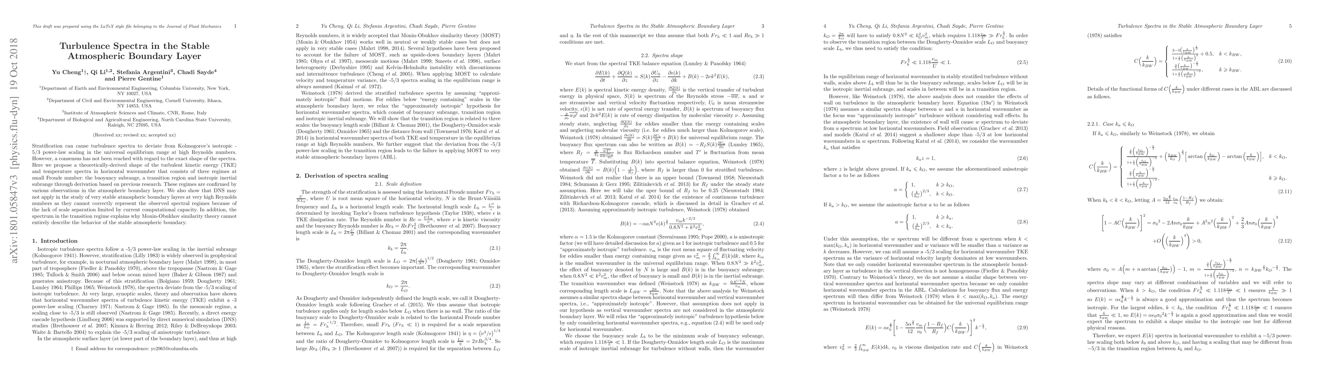 Stratification can cause turbulence spectra to deviate from Kolmogorov's isotropic -5/3 power-law scaling in the universal equilibrium range at high Reynolds numbers. However, a consensus has not been reached with regard to the exact shape of the spectra. Here we propose a theoretically-derived shape of the turbulent kinetic energy (TKE) and temperature spectra in horizontal wavenumber that consists of three regimes at small Froude number: the buoyancy subrange, a transition region and isotropic inertial subrange through derivation based on previous research. These regimes are confirmed by various observations in the atmospheric boundary layer. We also show that DNS may not apply in the study of very stable atmospheric boundary layers at very high Reynolds numbers as they cannot correctly represent the observed spectral regimes because of the lack of scale separation limited by current computational capacity. In addition, the spectrum in the transition regime explains why Monin-Obukhov similarity theory cannot entirely describe the behavior of the stable atmospheric boundary.