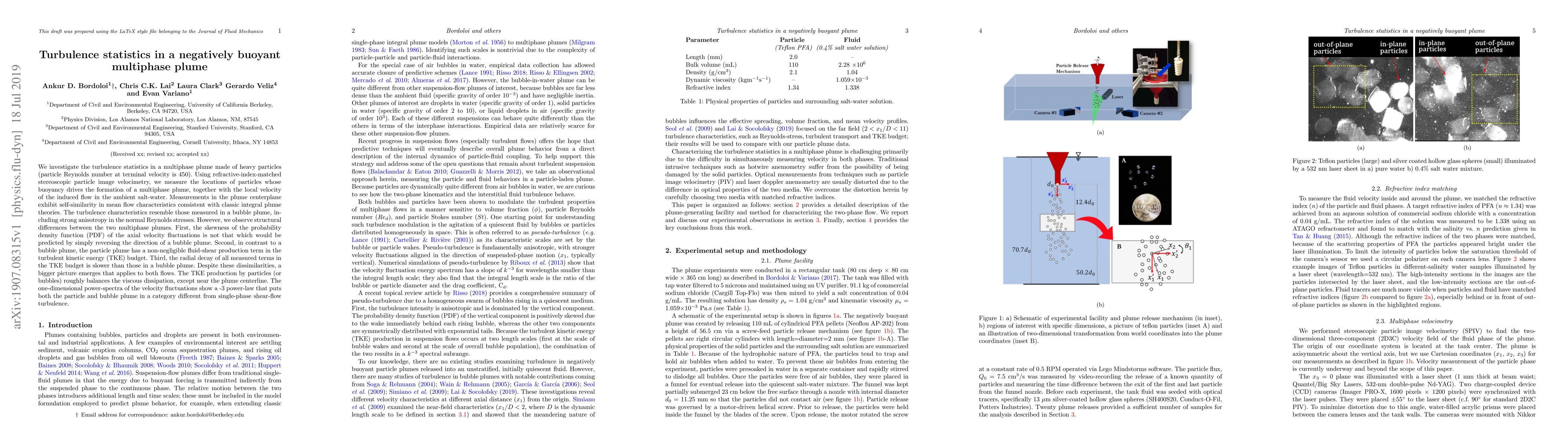 Researchers studied a negatively buoyant multiphase plume made of heavy particles in saltwater, finding that turbulence statistics resemble those of a bubble plume but with distinct differences, including a non-negligible fluid-shear production term.