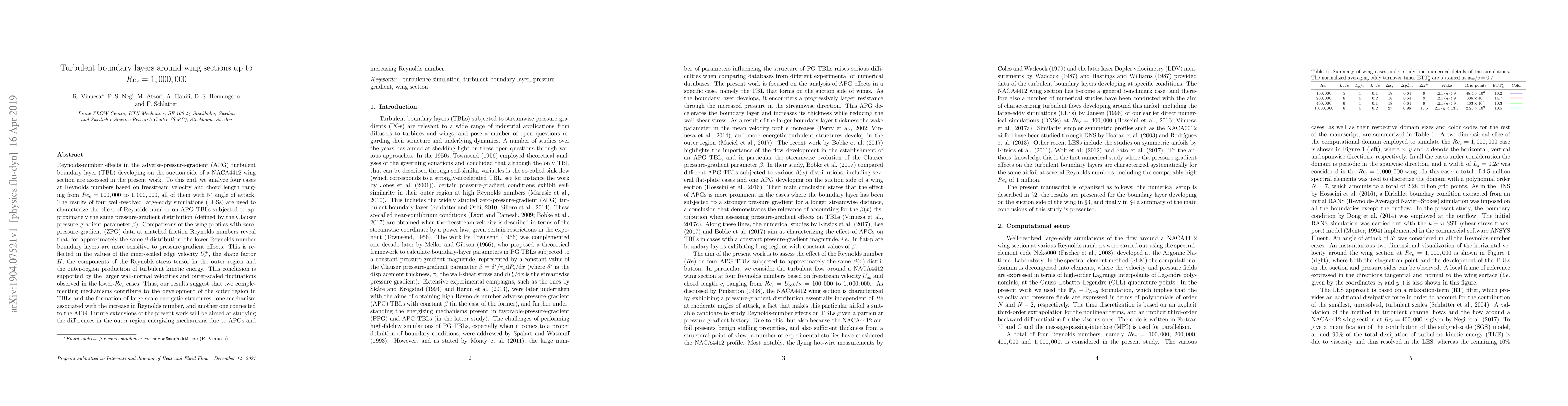 Reynolds-number effects in the adverse-pressure-gradient (APG) turbulent boundary layer (TBL) developing on the suction side of a NACA4412 wing section are assessed in the present work. To this end, we analyze four cases at Reynolds numbers based on freestream velocity and chord length ranging from Rec = 100, 000 to 1,000,000, all of them with 5 degree angle of attack. The results of four well-resolved large-eddy simulations (LESs) are used to characterize the effect of Reynolds number on APG TBLs subjected to approximately the same pressure-gradient distribution (defined by the Clauser pressure-gradient parameter beta). Comparisons of the wing profiles with zero-pressure-gradient (ZPG) data at matched friction Reynolds numbers reveal that, for approximately the same beta distribution, the lower-Reynolds-number boundary layers are more sensitive to pressure-gradient effects. This is reflected in the values of the inner-scaled edge velocity Ue+ , the shape factor H, the components of the Reynolds-stress tensor in the outer region and the outer-region production of turbulent kinetic energy. This conclusion is supported by the larger wall-normal velocities and outer-scaled fluctuations observed in the lower-Rec cases.Thus, our results suggest that two complementing mechanisms contribute to the development of the outer region in TBLs and the formation of large-scale energetic structures: one mechanism associated with the increase in Reynolds number, and another one connected to the APG. Future extensions of the present work will be aimed at studying the differences in the outer-region energizing mechanisms due to APGs and increasing Reynolds number.
