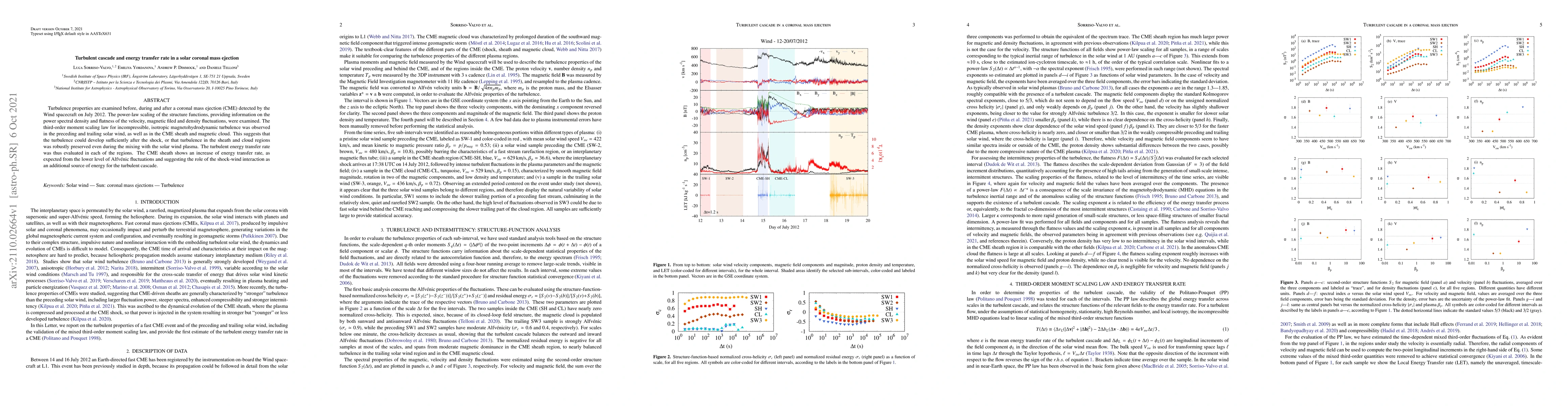 This study investigates turbulence properties during a coronal mass ejection (CME) observed in 2012, finding third-order moment scaling laws indicative of incompressible, isotropic magnetohydrodynamic turbulence in various regions. The CME sheath exhibits an increased energy transfer rate, suggesting shock-wind interactions contribute to the turbulent cascade.