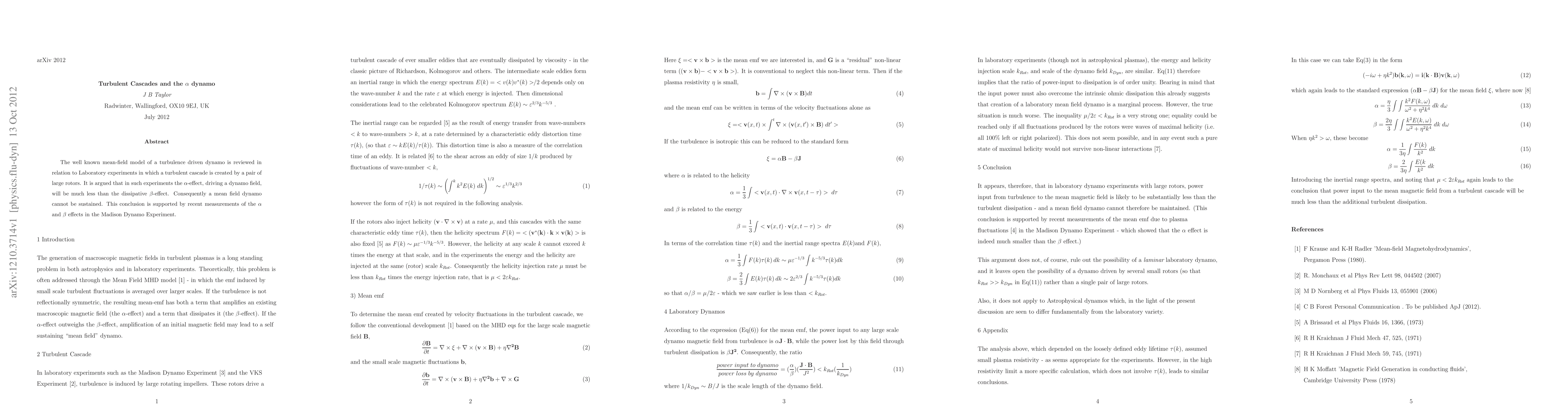 The research reviews the mean-field model of a turbulence-driven dynamo in relation to laboratory experiments using rotors to create a turbulent cascade. It argues that in such setups, the alpha-effect driving a dynamo field is less than the dissipative beta-effect, making sustenance of a mean-field dynamo unlikely.