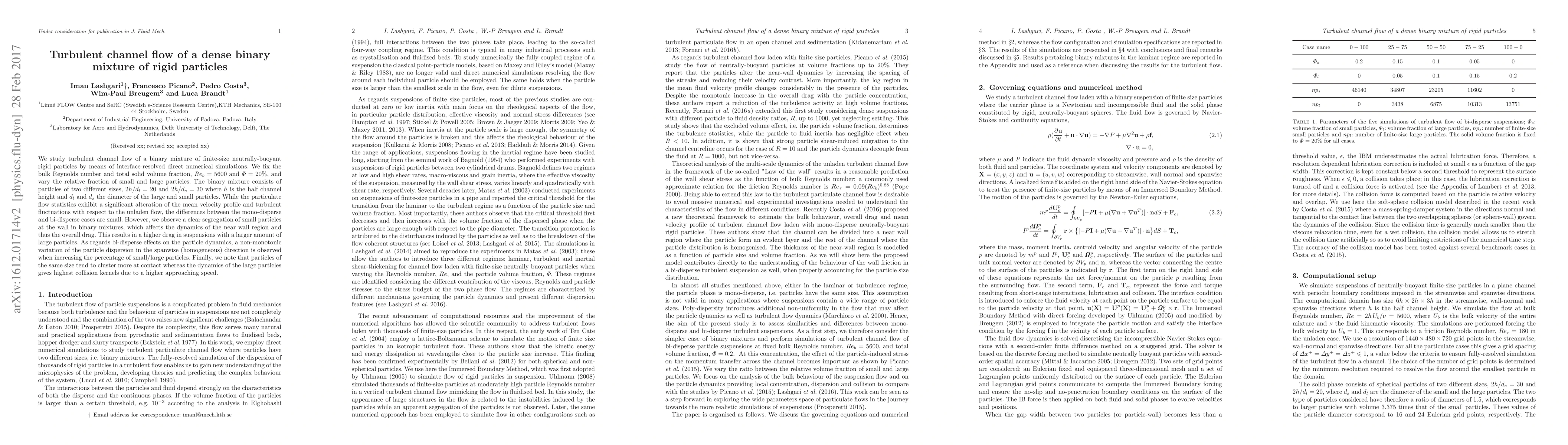 We study turbulent channel flow of a binary mixture of finite-size neutrally-buoyant rigid particles by means of interface-resolved direct numerical simulations. We fix the bulk Reynolds number and total solid volume fraction, $Re_b = 5600$ and $\Phi=20\%$, and vary the relative fraction of small and large particles. The binary mixture consists of particles of two different sizes, $2h/d_l=20$ and $2h/d_s=30$ where $h$ is the half channel height and $d_l$ and $d_s$ the diameter of the large and small particles. While the particulate flow statistics exhibit a significant alteration of the mean velocity profile and turbulent fluctuations with respect to the unladen flow, the differences between the mono-disperse and bi-disperse cases are small. However, we observe a clear segregation of small particles at the wall in binary mixtures, which affects the dynamics of the near wall region and thus the overall drag. This results in a higher drag in suspensions with a larger amount of large particles. As regards bi-disperse effects on the particle dynamics, a non-monotonic variation of the particle dispersion in the spanwise (homogeneous) direction is observed when increasing the percentage of small/large particles. Finally, we note that particles of the same size tend to cluster more at contact whereas the dynamics of the large particles gives highest collision kernels due to a higher approaching speed.