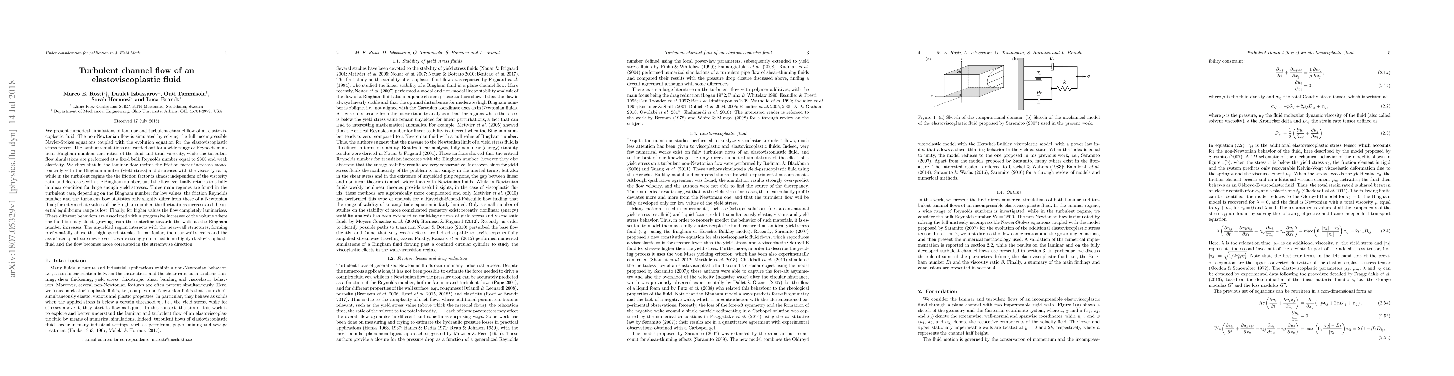 This paper investigates laminar and turbulent channel flows of elastoviscoplastic fluids using numerical simulations. It finds that laminar flow friction factor increases with yield stress but decreases with viscosity ratio, while in turbulent flow, the friction factor is nearly independent of viscosity ratio and decreases with yield stress until laminarization occurs at high yield stresses. Three regimes are identified in turbulent flow based on the Bingham number, with increasing fluid regions that are not yielded affecting near-wall structures and enhancing high-speed streaks.