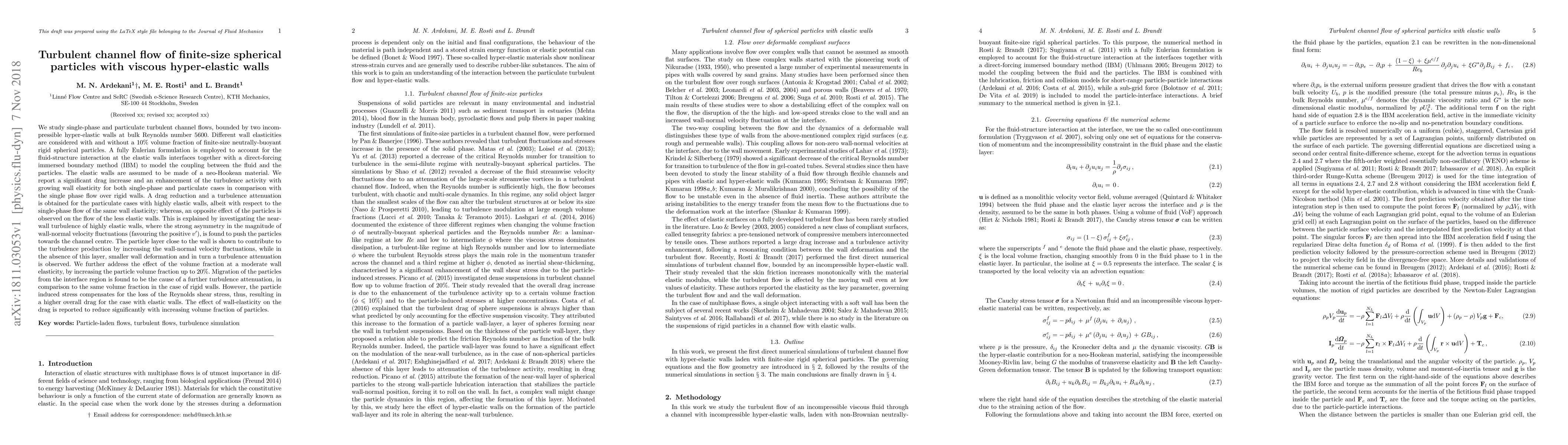 This study investigates turbulent channel flows with finite-size spherical particles in hyper-elastic walls, finding increased drag and turbulence with higher wall elasticity. Particulate flows show drag reduction and turbulence attenuation with highly elastic walls, while less elastic walls exhibit the opposite effect.