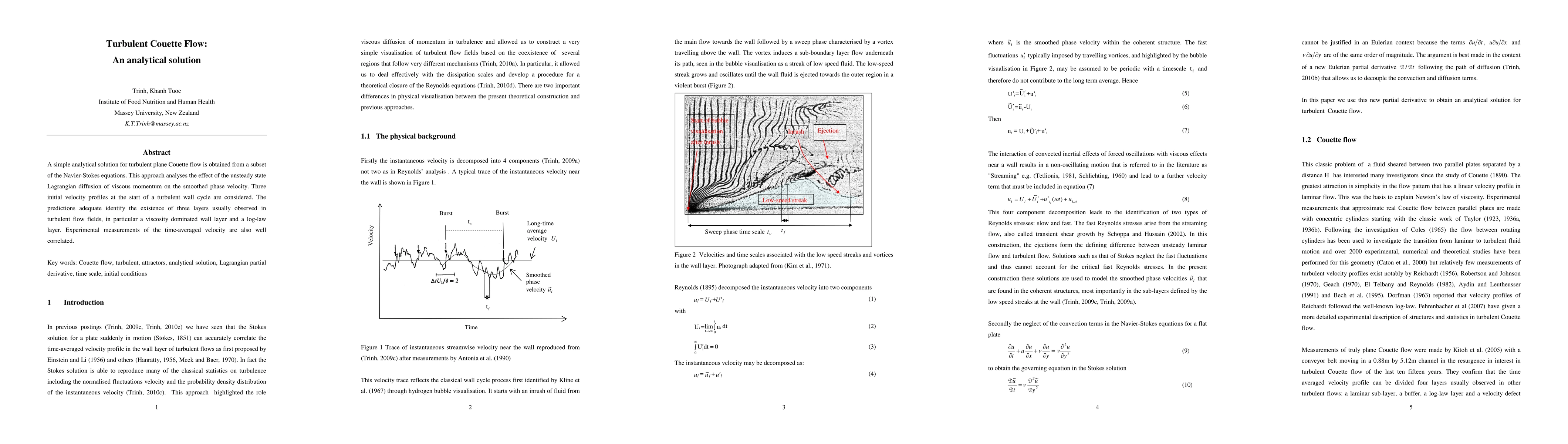 A simple analytical solution for turbulent plane Couette flow is obtained from a subset of the Navier-Stokes equations. This approach analyses the effect of the unsteady state Lagrangian diffusion of viscous momentum on the smoothed phase velocity. Three initial velocity profiles at the start of a turbulent wall cycle are considered. The predictions adequate identify the existence of three layers usually observed in turbulent flow fields, in particular a viscosity dominated wall layer and a log-law layer. Experimental measurements of time-averaged velocity are also well correlated. Key words: Couette flow, turbulent, attractors, analytical solution, Lagrangian partial derivative, time scale, initial conditions