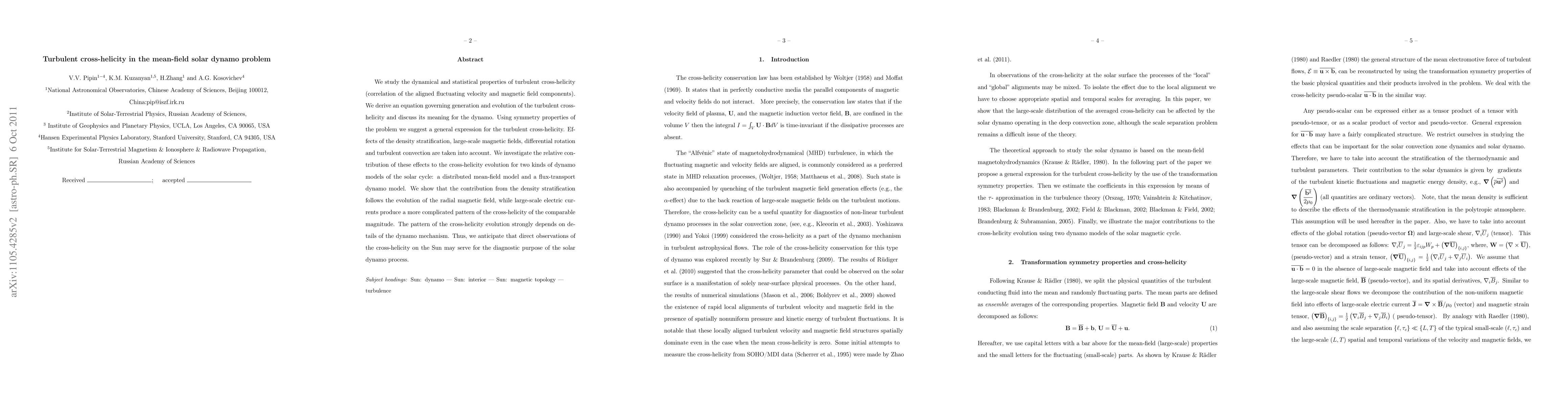 This paper investigates the turbulent cross-helicity in solar dynamo models, deriving equations for its generation and evolution. It finds that the cross-helicity's pattern depends on factors like density stratification and large-scale magnetic fields, suggesting that observations of cross-helicity could diagnose the solar dynamo mechanism.