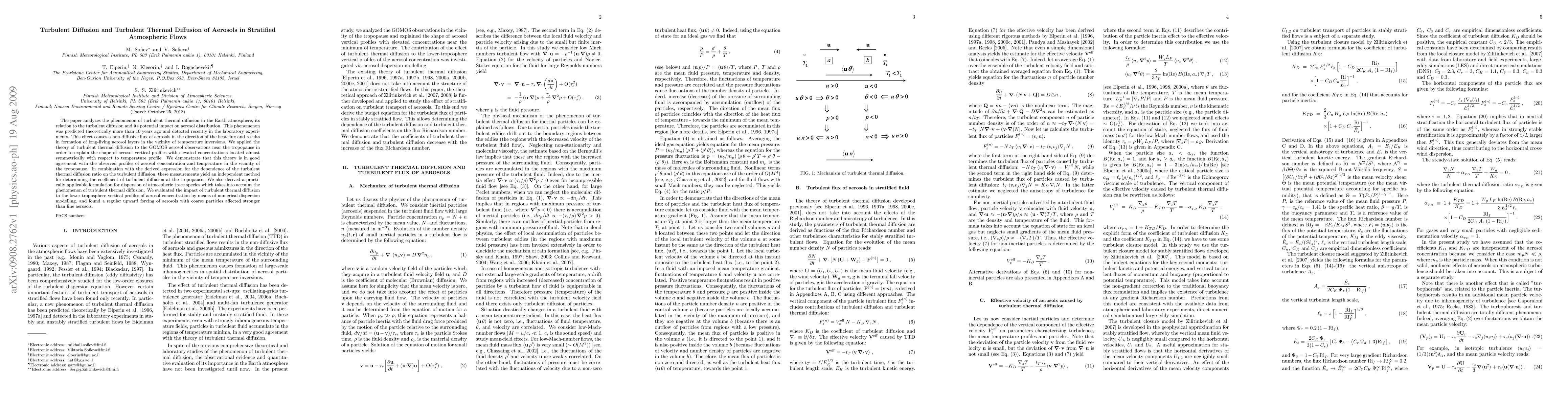 The paper analyzes the phenomenon of turbulent thermal diffusion in the Earth atmosphere, its relation to the turbulent diffusion and its potential impact on aerosol distribution. This phenomenon was predicted theoretically more than 10 years ago and detected recently in the laboratory experiments. This effect causes a non-diffusive flux of aerosols in the direction of the heat flux and results in formation of long-living aerosol layers in the vicinity of temperature inversions. We demonstrated that the theory of turbulent thermal diffusion explains the GOMOS aerosol observations near the tropopause (i.e., the observed shape of aerosol vertical profiles with elevated concentrations located almost symmetrically with respect to temperature profile). In combination with the derived expression for the dependence of the turbulent thermal diffusion ratio on the turbulent diffusion, these measurements yield an independent method for determining the coefficient of turbulent diffusion at the tropopause. We evaluated the impact of turbulent thermal diffusion to the lower-troposphere vertical profiles of aerosol concentration by means of numerical dispersion modelling, and found a regular upward forcing of aerosols with coarse particles affected stronger than fine aerosols.