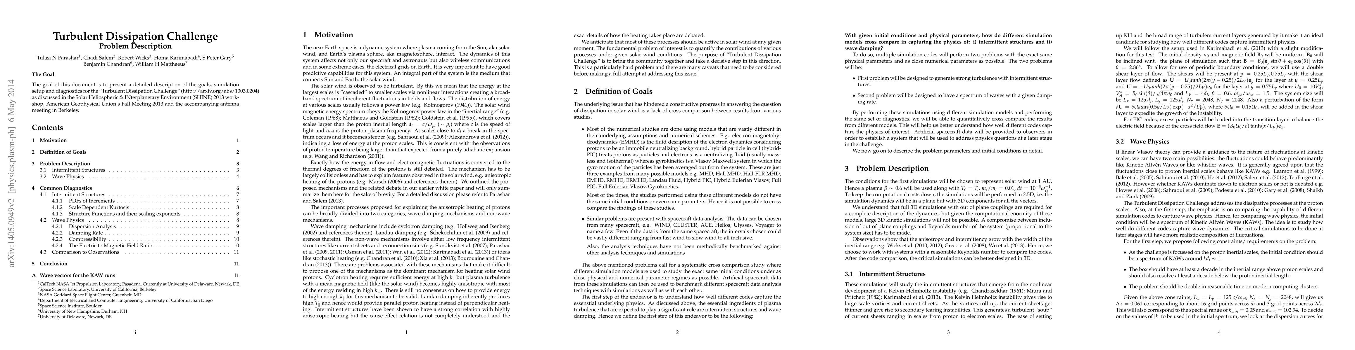 The goal of this document is to present a detailed description of the goals, simulation setup and diagnostics for the Turbulent Dissipation Challenge (arXiv:1303.0204) as discussed in the Solar Heliospheric and INterplanetary Environment (SHINE) 2013 workshop, American Geophysical Union Fall Meeting 2013 and the accompanying antenna meeting in Berkeley.