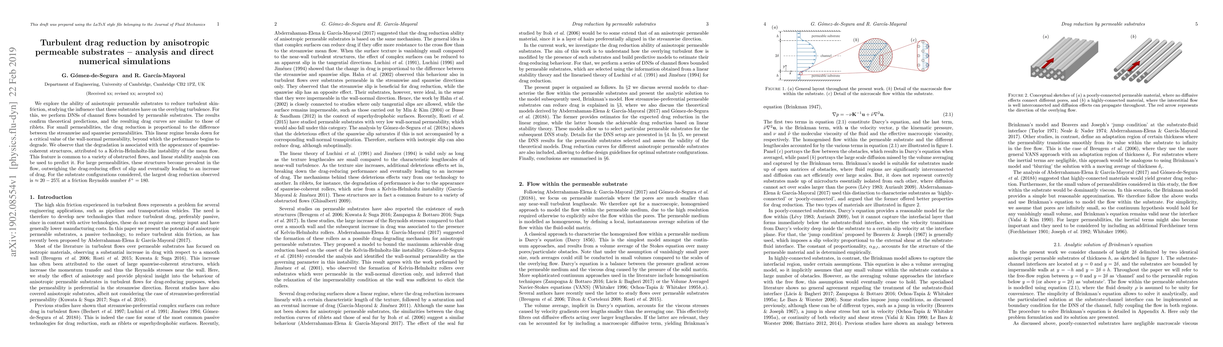 We explore the ability of anisotropic permeable substrates to reduce turbulent skin-friction, studying the influence that these substrates have on the overlying turbulence. For this, we perform DNSs of channel flows bounded by permeable substrates. The results confirm theoretical predictions, and the resulting drag curves are similar to those of riblets. For small permeabilities, the drag reduction is proportional to the difference between the streamwise and spanwise permeabilities. This linear regime breaks down for a critical value of the wall-normal permeability, beyond which the performance begins to degrade. We observe that the degradation is associated with the appearance of spanwise-coherent structures, attributed to a Kelvin-Helmholtz-like instability of the mean flow. This feature is common to a variety of obstructed flows, and linear stability analysis can be used to predict it. For large permeabilities, these structures become prevalent in the flow, outweighing the drag-reducing effect of slip and eventually leading to an increase of drag. For the substrate configurations considered, the largest drag reduction observed is $\approx 20-25\%$ at a friction Reynolds number $\delta^+ = 180$.