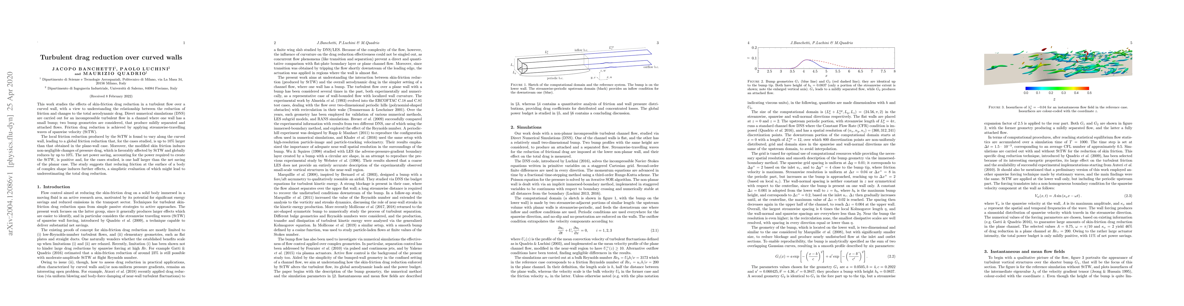 This study investigates turbulent drag reduction over curved walls using spanwise-travelling waves of velocity, finding significant friction and pressure drag reductions. The net power saving is higher than in planar cases, indicating complex shapes benefit more from friction reduction.