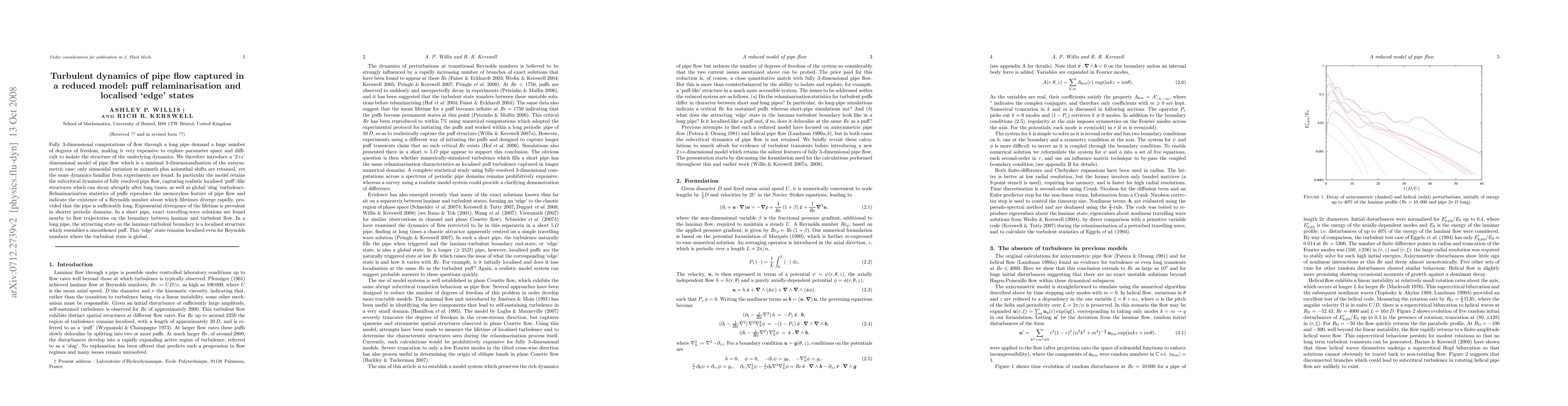 This paper introduces a reduced `2+epsilon' dimensional model to simulate turbulent dynamics in pipe flow, capturing localized puff-like structures and global slug turbulence. The model reveals relaminarisation features and the existence of a critical Reynolds number where puff lifetimes diverge, highlighting the presence of localised edge states in long pipes.