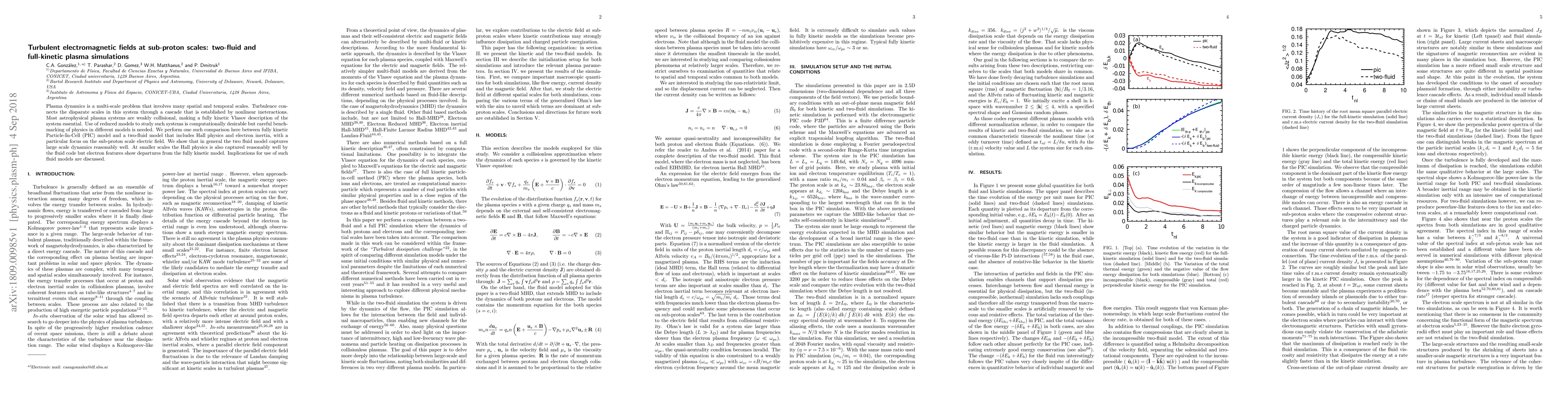 This paper compares fully kinetic Particle-In-Cell (PIC) simulations with a two-fluid model to study turbulent electromagnetic fields in weakly collisional plasmas, focusing on sub-proton scales. The two-fluid model captures large-scale dynamics and Hall effects well but shows discrepancies at smaller scales, particularly in electron features, highlighting the limitations of fluid models in fully kinetic regimes.