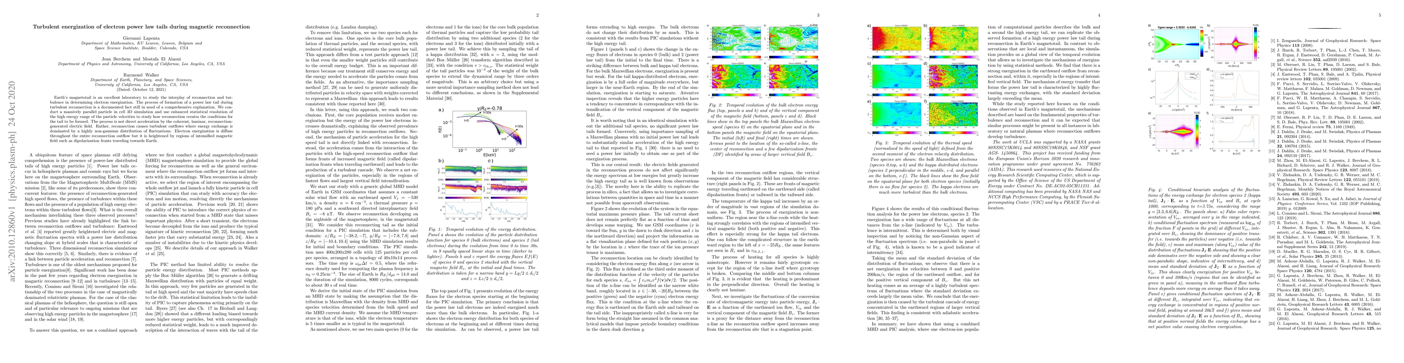 This study uses 3D simulations to explore how magnetic reconnection in Earth's magnetotail generates turbulent outflows, leading to the formation of electron power law tails. The energization process is driven by non-Gaussian fluctuations and intensified magnetic fields, rather than direct acceleration by reconnection electric fields.