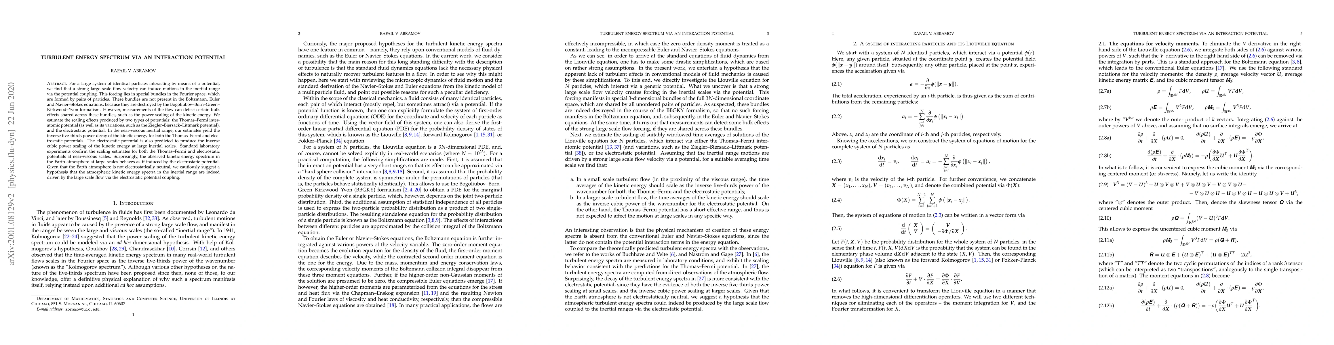 For a large system of identical particles interacting by means of a potential, we find that a strong large scale flow velocity can induce motions in the inertial range via the potential coupling. This forcing lies in special bundles in the Fourier space, which are formed by pairs of particles. These bundles are not present in the Boltzmann, Euler and Navier-Stokes equations, because they are destroyed by the Bogoliubov-Born-Green-Kirkwood-Yvon formalism. However, measurements of the flow can detect certain bulk effects shared across these bundles, such as the power scaling of the kinetic energy. We estimate the scaling effects produced by two types of potentials: the Thomas-Fermi interatomic potential (as well as its variations, such as the Ziegler-Biersack-Littmark potential), and the electrostatic potential. In the near-viscous inertial range, our estimates yield the inverse five-thirds power decay of the kinetic energy for both the Thomas-Fermi and electrostatic potentials. The electrostatic potential is also predicted to produce the inverse cubic power scaling of the kinetic energy at large inertial scales. Standard laboratory experiments confirm the scaling estimates for both the Thomas-Fermi and electrostatic potentials at near-viscous scales. Surprisingly, the observed kinetic energy spectrum in the Earth atmosphere at large scales behaves as if induced by the electrostatic potential. Given that the Earth atmosphere is not electrostatically neutral, we cautiously suggest a hypothesis that the atmospheric kinetic energy spectra in the inertial range are indeed driven by the large scale flow via the electrostatic potential coupling.