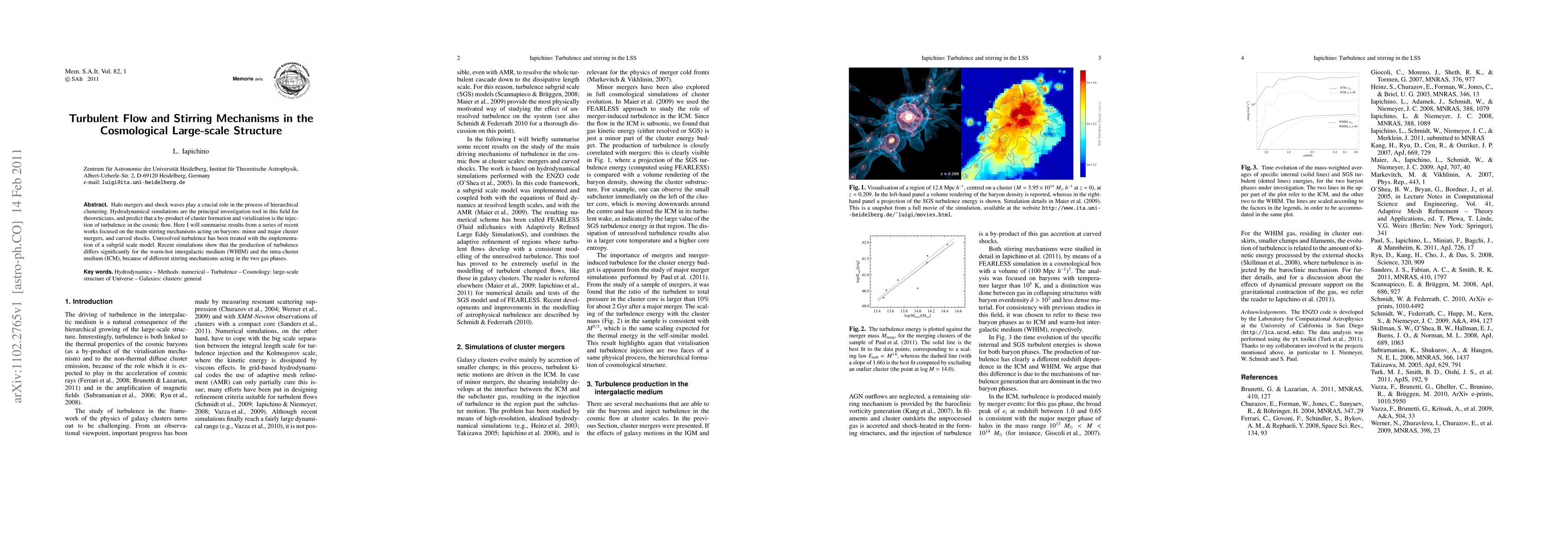 This paper summarizes recent simulations on turbulence in cosmological large-scale structures, focusing on the stirring mechanisms of halo mergers and shock waves, and highlights the differences in turbulence production between the warm-hot intergalactic medium and the intra-cluster medium due to distinct stirring processes.