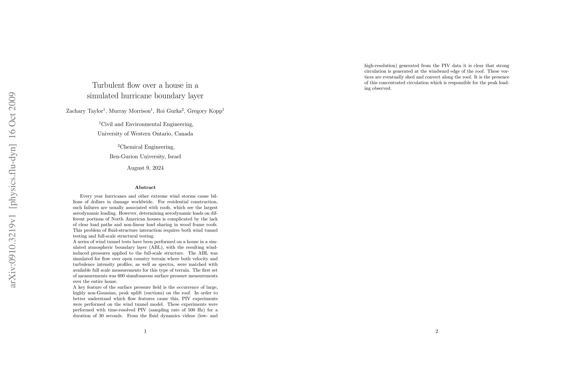 Every year hurricanes and other extreme wind storms cause billions of dollars in damage worldwide. For residential construction, such failures are usually associated with roofs, which see the largest aerodynamic loading. However, determining aerodynamic loads on different portions of North American houses is complicated by the lack of clear load paths and non-linear load sharing in wood frame roofs. This problem of fluid-structure interaction requires both wind tunnel testing and full-scale structural testing. A series of wind tunnel tests have been performed on a house in a simulated atmospheric boundary layer (ABL), with the resulting wind-induced pressures applied to the full-scale structure. The ABL was simulated for flow over open country terrain where both velocity and turbulence intensity profiles, as well as spectra, were matched with available full scale measurements for this type of terrain. The first set of measurements was 600 simultaneous surface pressure measurements over the entire house. A key feature of the surface pressure field is the occurrence of large, highly non-Gaussian, peak uplift (suctions) on the roof. In order to better understand which flow features cause this, PIV experiments were performed on the wind tunnel model. These experiments were performed with time-resolved PIV (sampling rate of 500 Hz) for a duration of 30 seconds. From the fluid dynamics videos (low- and high-resolution) generated from the PIV data it is clear that strong circulation is generated at the windward edge of the roof. These vortices are eventually shed and convect along the roof. It is the presence of this concentrated circulation which is responsible for the peak loading observed.