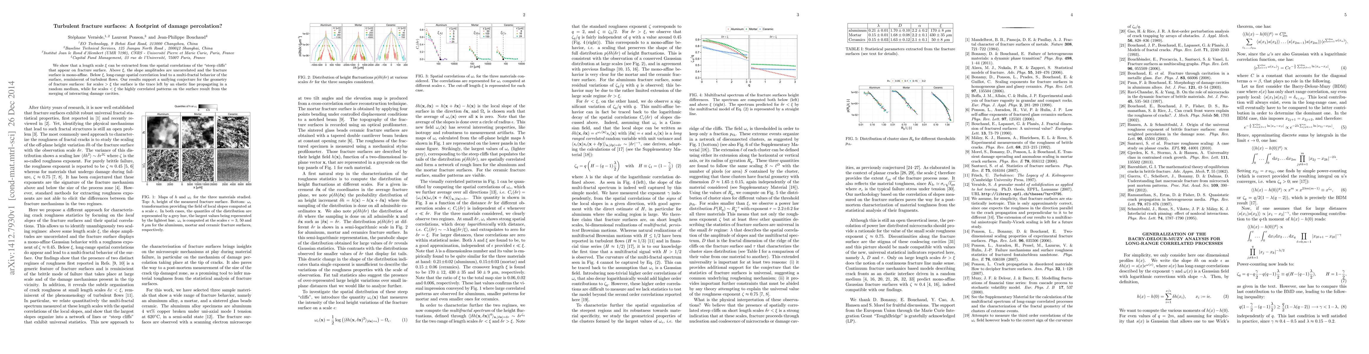 We show that a length scale xi can be extracted from the spatial correlations of the "steep cliffs" that appear on fracture surface. Above xi, the slope amplitudes are uncorrelated and the fracture surface is mono-affine. Below xi, long-range spatial correlation lead to a multi-fractal behavior of the surface, reminiscent of turbulent flows. Our results support a unifying conjecture for the geometry of fracture surfaces: for scales > \xi the surface is the trace left by an elastic line propagating in a random medium, while for scales < \xi the highly correlated patterns on the surface result from the merging of interacting damage cavities.