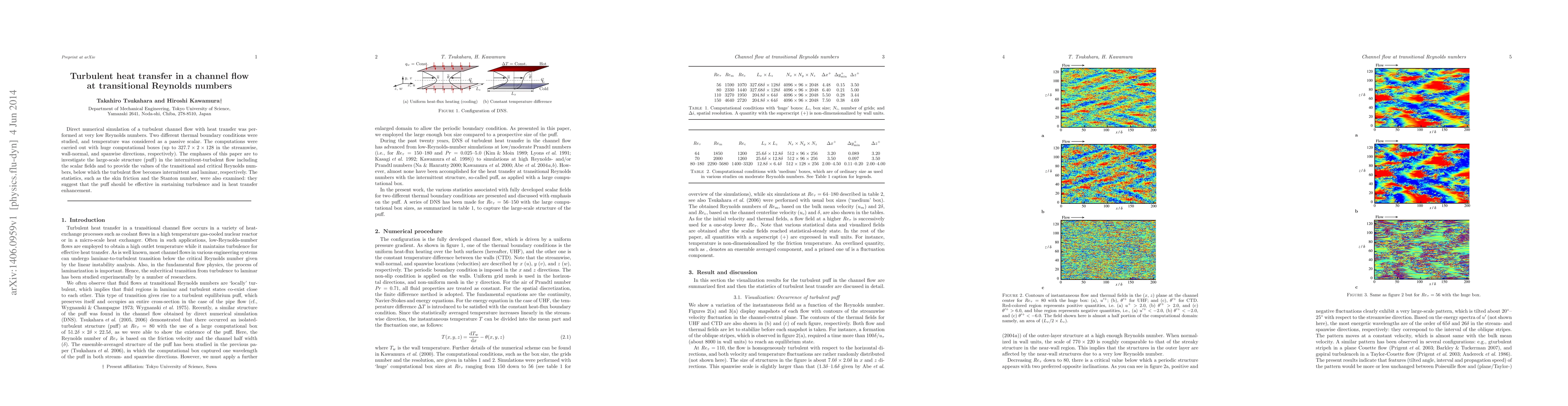 This paper uses direct numerical simulations to study turbulent heat transfer in channel flows at transitional Reynolds numbers, focusing on large-scale structures known as puffs. The study provides critical Reynolds numbers for the transition from intermittent turbulence to laminar flow and highlights the role of puffs in sustaining turbulence and enhancing heat transfer.