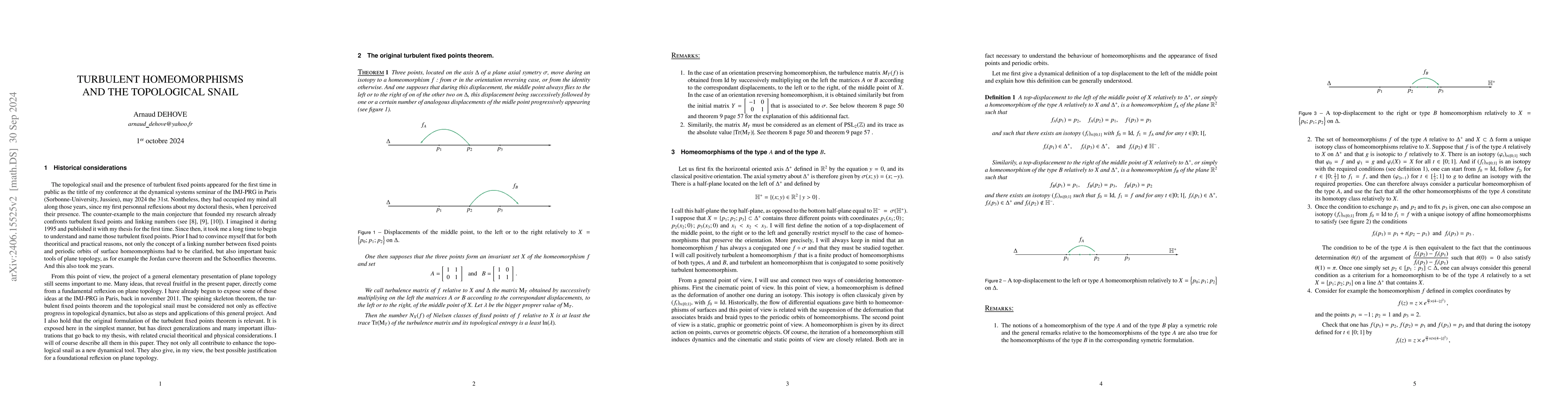 The topological snail is a geometric universal plane object, described by matrices in the special linear group with integer coefficients. It has many nice properties. From a dynamical point of view, it gives a description of the set of fixed points and periodic obits of turbulent homeomorphims in the plane. Those homeomorphisms are the truly complicated one. They have many fixed points and periodic orbits, as much as the trace of the turbulence matrix that caracterizes their action on a finite invariant set. The topological snail generally gives a map of the fixed points and periodic orbits of a such homeomorphims. One can compute their indexes and turbulent topological types, and different Nielsen's classes of fixed points naturally give a minoration of the topological entropy of the considered homeomorphisms by the logarithm of the spectral radius of the turbulence matrix. One even get a dynamical interpretation and proof of the extension of the Fermat' theorem to matrices. I first described the topological snail and its properties at my conference the 31st of may 2024 in Paris, in the case of a purely turbulent homeomorphism, with an invariant set of three points.