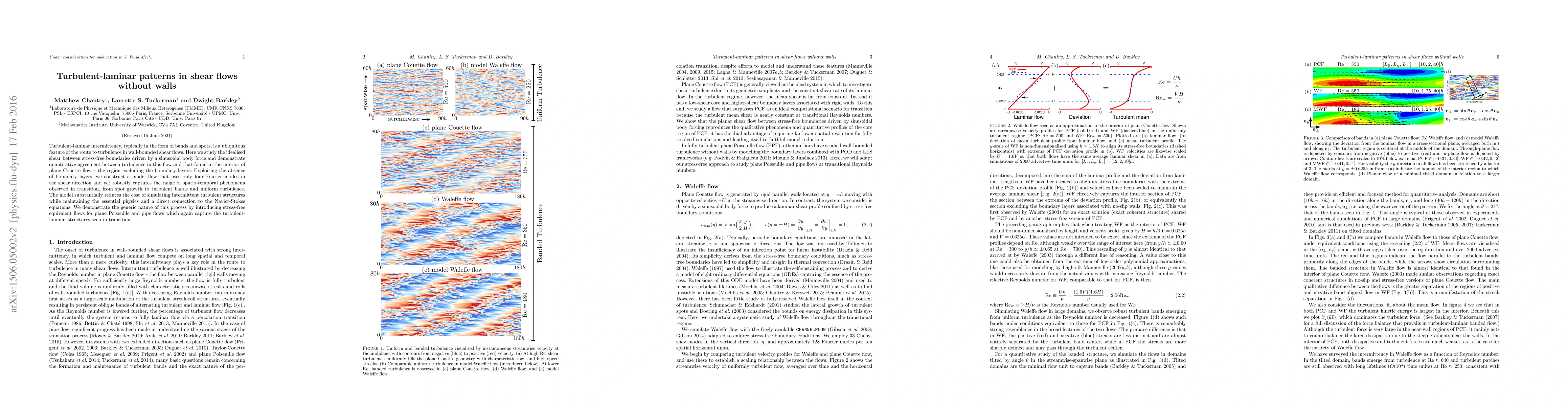 Turbulent-laminar intermittency, typically in the form of bands and spots, is a ubiquitous feature of the route to turbulence in wall-bounded shear flows. Here we study the idealised shear between stress-free boundaries driven by a sinusoidal body force and demonstrate quantitative agreement between turbulence in this flow and that found in the interior of plane Couette flow -- the region excluding the boundary layers. Exploiting the absence of boundary layers, we construct a model flow that uses only four Fourier modes in the shear direction and yet robustly captures the range of spatiotemporal phenomena observed in transition, from spot growth to turbulent bands and uniform turbulence. The model substantially reduces the cost of simulating intermittent turbulent structures while maintaining the essential physics and a direct connection to the Navier-Stokes equations. We demonstrate the generic nature of this process by introducing stress-free equivalent flows for plane Poiseuille and pipe flows which again capture the turbulent-laminar structures seen in transition.