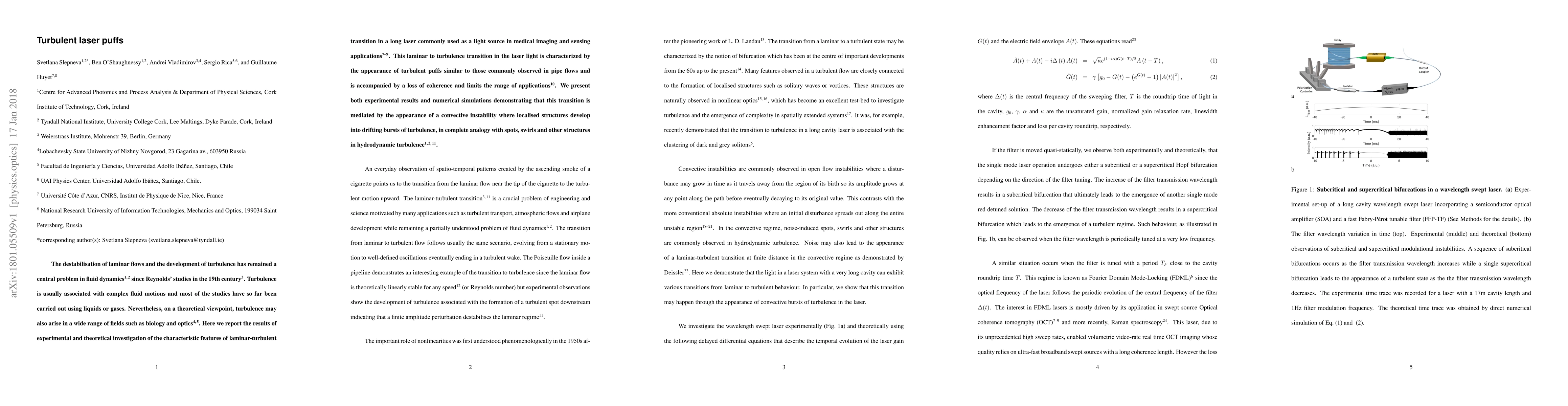 The destabilisation of laminar flows and the development of turbulence has remained a central problem in fluid dynamics since Reynolds' studies in the 19th century. Turbulence is usually associated with complex fluid motions and most of the studies have so far been carried out using liquids or gases. Nevertheless, on a theoretical viewpoint, turbulence may also arise in a wide range of fields such as biology and optics. Here we report the results of experimental and theoretical investigation of the characteristic features of laminar-turbulent transition in a long laser commonly used as a light source in medical imaging and sensing applications. This laminar to turbulence transition in the laser light is characterized by the appearance of turbulent puffs similar to those commonly observed in pipe flows and is accompanied by a loss of coherence and limits the range of applications. We present both experimental results and numerical simulations demonstrating that this transition is mediated by the appearance of a convective instability where localised structures develop into drifting bursts of turbulence, in complete analogy with spots, swirls and other structures in hydrodynamic turbulence