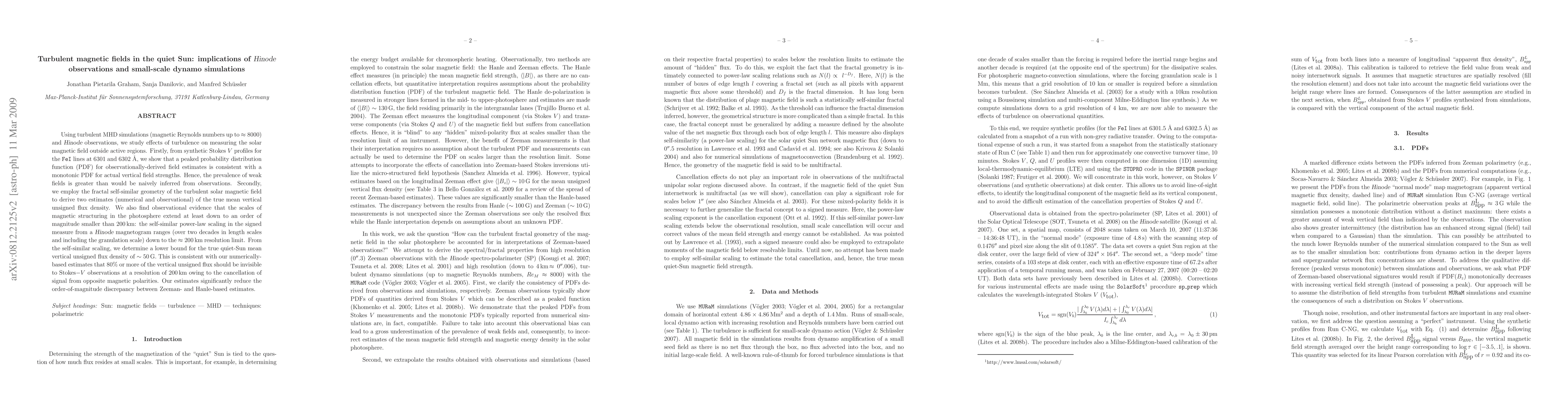 Using turbulent MHD simulations (magnetic Reynolds numbers up to 8000) and Hinode observations, we study effects of turbulence on measuring the solar magnetic field outside active regions. Firstly, from synthetic Stokes V profiles for the FeI lines at 630.1 and 630.2 nm, we show that a peaked probability distribution function (PDF) for observationally-derived field estimates is consistent with a monotonic PDF for actual vertical field strengths. Hence, the prevalence of weak fields is greater than would be naively inferred from observations. Secondly, we employ the fractal self-similar geometry of the turbulent solar magnetic field to derive two estimates (numerical and observational) of the true mean vertical unsigned flux density. We also find observational evidence that the scales of magnetic structuring in the photosphere extend at least down to an order of magnitude smaller than 200 km: the self-similar power-law scaling in the signed measure from a Hinode magnetogram ranges (over two decades in length scales and including the granulation scale) down to the 200 km resolution limit. From the self-similar scaling, we determine a lower bound for the true quiet-Sun mean vertical unsigned flux density of ~50 G. This is consistent with our numerically-based estimates that 80% or more of the vertical unsigned flux should be invisible to Stokes-V observations at a resolution of 200 km owing to the cancellation of signal from opposite magnetic polarities. Our estimates significantly reduce the order-of-magnitude discrepancy between Zeeman- and Hanle-based estimates.