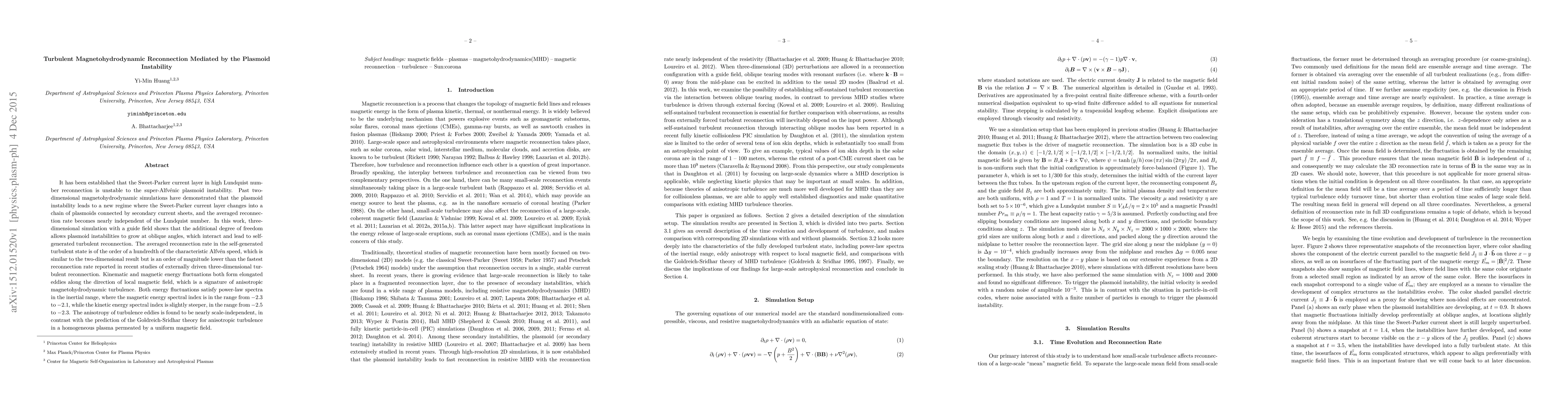 This paper investigates the turbulent magnetohydrodynamic reconnection mediated by the plasmoid instability in three-dimensional simulations, showing that plasmoids grow at oblique angles to generate self-generated turbulent reconnection. The reconnection rate is an order of magnitude lower than externally driven turbulent reconnection, and exhibits anisotropic magnetohydrodynamic turbulence with scale-independent anisotropy.