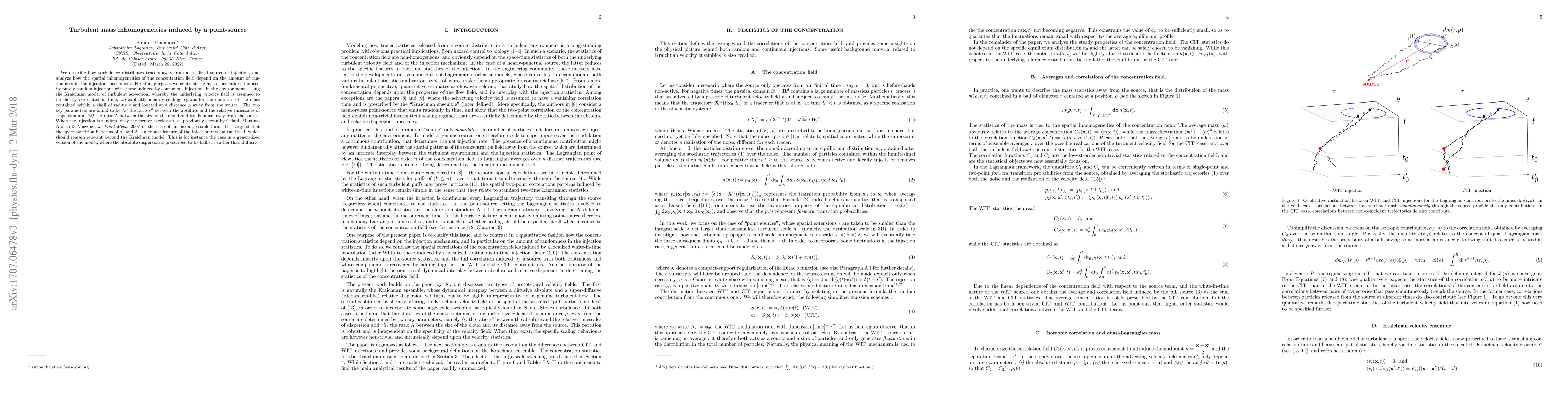 We describe how turbulence distributes tracers away from a localized source of injection, and analyse how the spatial inhomogeneities of the concentration field depend on the amount of randomness in the injection mechanism. For that purpose, we contrast the mass correlations induced by purely random injections with those induced by continuous injections in the environment. Using the Kraichnan model of turbulent advection, whereby the underlying velocity field is assumed to be shortly correlated in time, we explicitly identify scaling regions for the statistics of the mass contained within a shell of radius $r$ and located at a distance $\rho$ away from the source. The two key parameters are found to be (i) the ratio $s^2$ between the absolute and the relative timescales of dispersion and (ii) the ratio $\Lambda$ between the size of the cloud and its distance away from the source. When the injection is random, only the former is relevant, as previously shown by Celani, Martins-Afonso $\&$ Mazzino, $J. Fluid. Mech$, 2007 in the case of an incompressible fluid. It is argued that the space partition in terms of $s^2$ and $\Lambda$ is a robust feature of the injection mechanism itself, which should remain relevant beyond the Kraichnan model. This is for instance the case in a generalised version of the model, where the absolute dispersion is prescribed to be ballistic rather than diffusive.