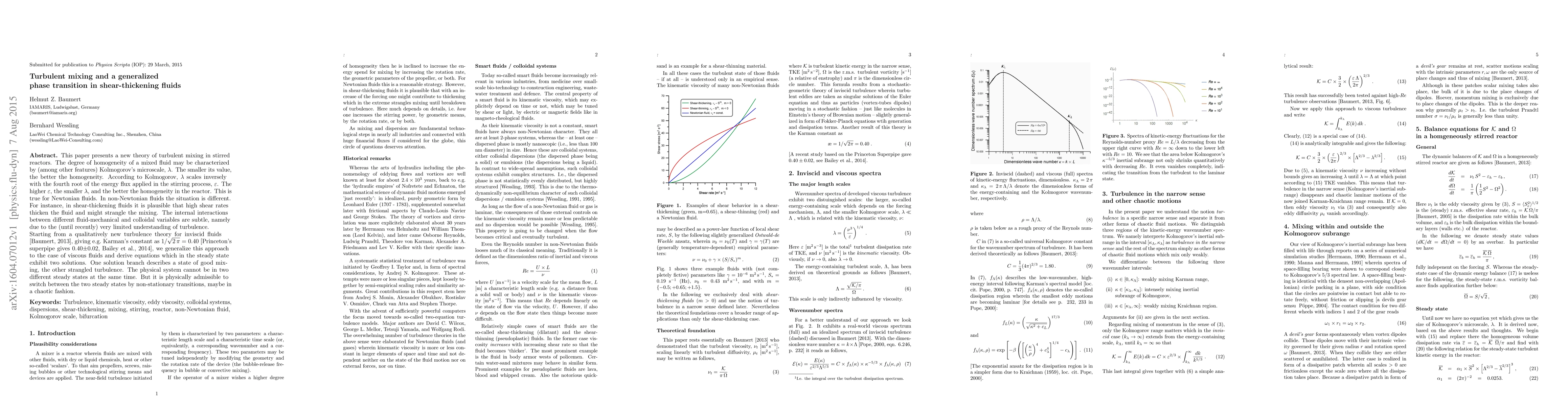 This paper develops a new theory for turbulent mixing in stirred reactors, showing that high energy dissipation rates improve homogeneity in Newtonian fluids. For shear-thickening fluids, it proposes a generalized phase transition model where high shear rates can either enhance or hinder mixing, leading to two steady-state solutions: one of good mixing and one of strangled turbulence, which can be transitioned between through non-stationary processes.