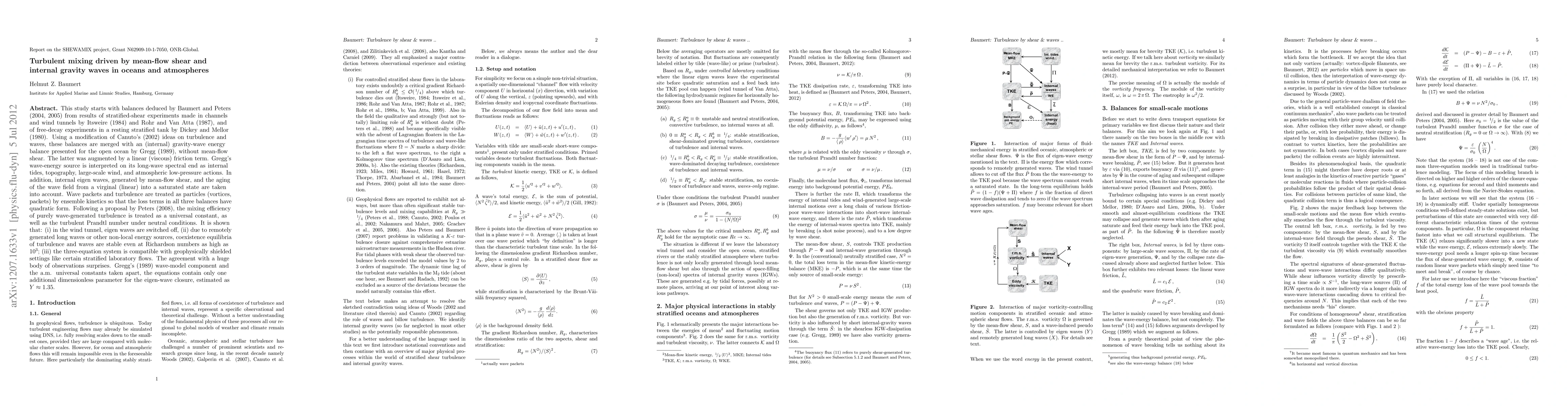 This paper merges balances from stratified-shear and free-decay experiments with a gravity-wave energy balance to model turbulent mixing driven by mean-flow shear and internal gravity waves in oceans and atmospheres. The study finds stable coexistence equilibria of turbulence and waves even at high Richardson numbers and agrees with a large body of observational data.