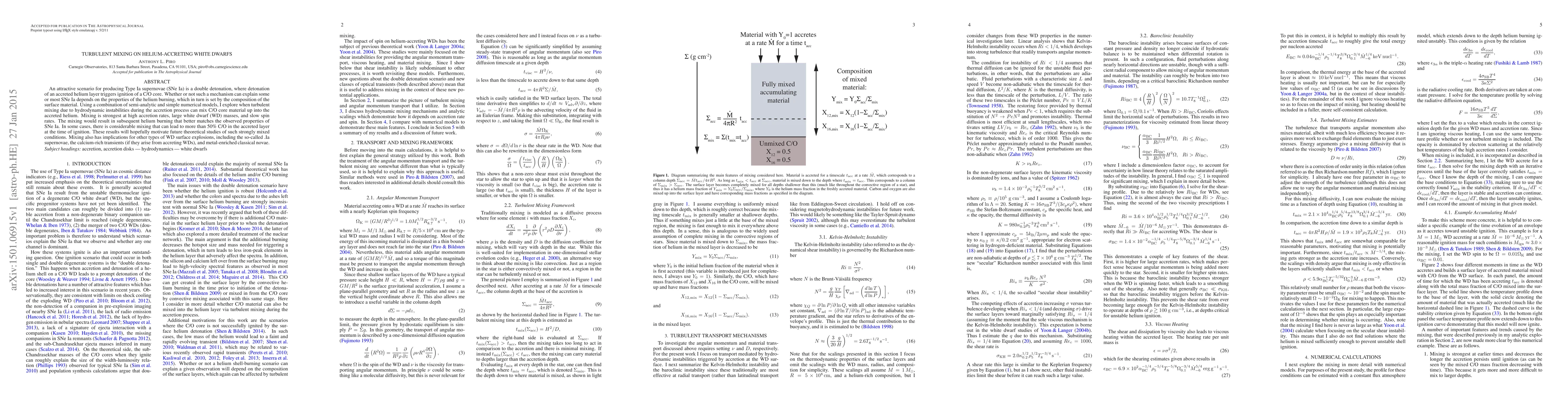 The paper presents analytical estimates and numerical models to describe turbulent mixing in helium-accreting white dwarfs, highlighting the role of hydrodynamic instabilities in mixing C/O core material with the accreted helium layer.