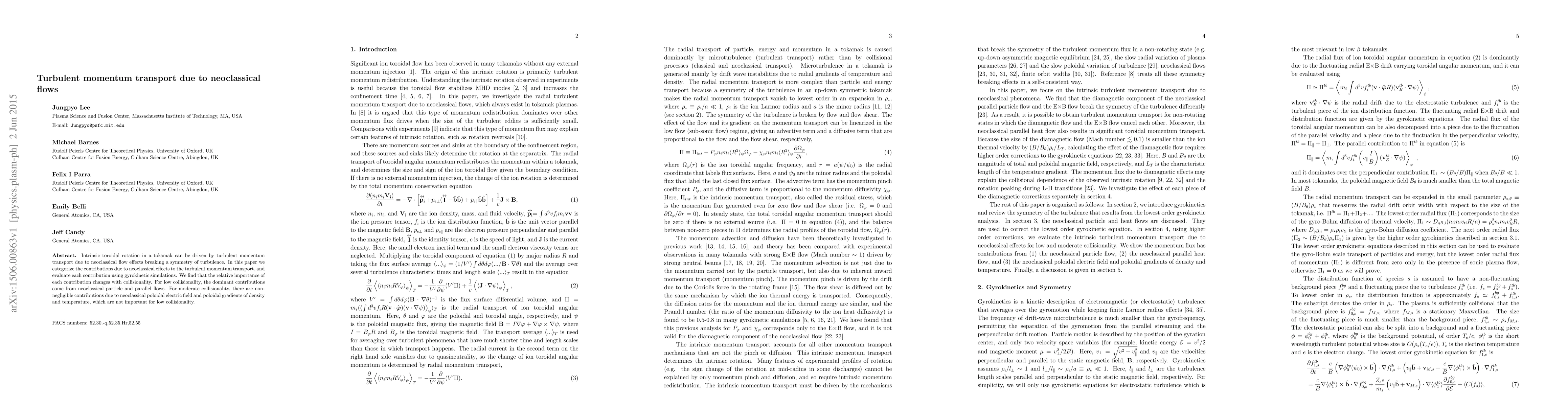 Intrinsic toroidal rotation in a tokamak can be driven by turbulent momentum transport due to neoclassical flow effects breaking a symmetry of turbulence. In this paper we categorize the contributions due to neoclassical effects to the turbulent momentum transport, and evaluate each contribution using gyrokinetic simulations. We find that the relative importance of each contribution changes with collisionality. For low collisionality, the dominant contributions come from neoclassical particle and parallel flows. For moderate collisionality, there are non- negligible contributions due to neoclassical poloidal electric field and poloidal gradients of density and temperature, which are not important for low collisionality.