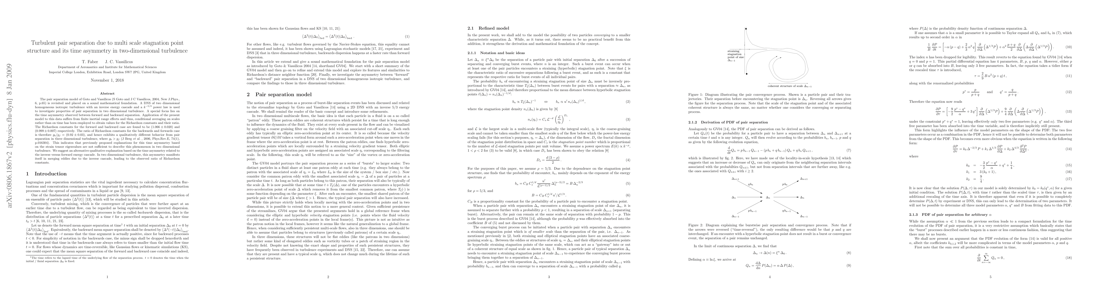 This paper revisits the pair separation model in two-dimensional turbulence, finding a time asymmetry between forward and backward separation. The study reveals that the Richardson constants differ, indicating a distinct behavior from three-dimensional turbulence, suggesting that the inverse energy cascade plays a key role in this asymmetry.