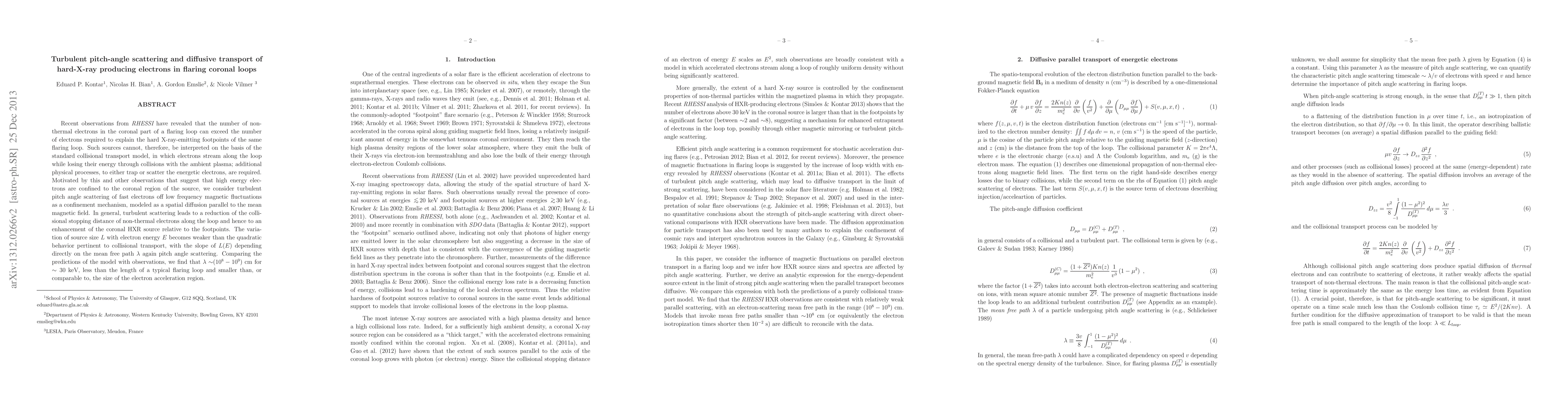 This paper investigates the turbulent pitch-angle scattering of high-energy electrons in flaring coronal loops, proposing it as a mechanism for confining these electrons and enhancing hard X-ray emission. The model suggests that this scattering reduces the collisional stopping distance, leading to a weaker dependence of source size on electron energy compared to collisional transport.