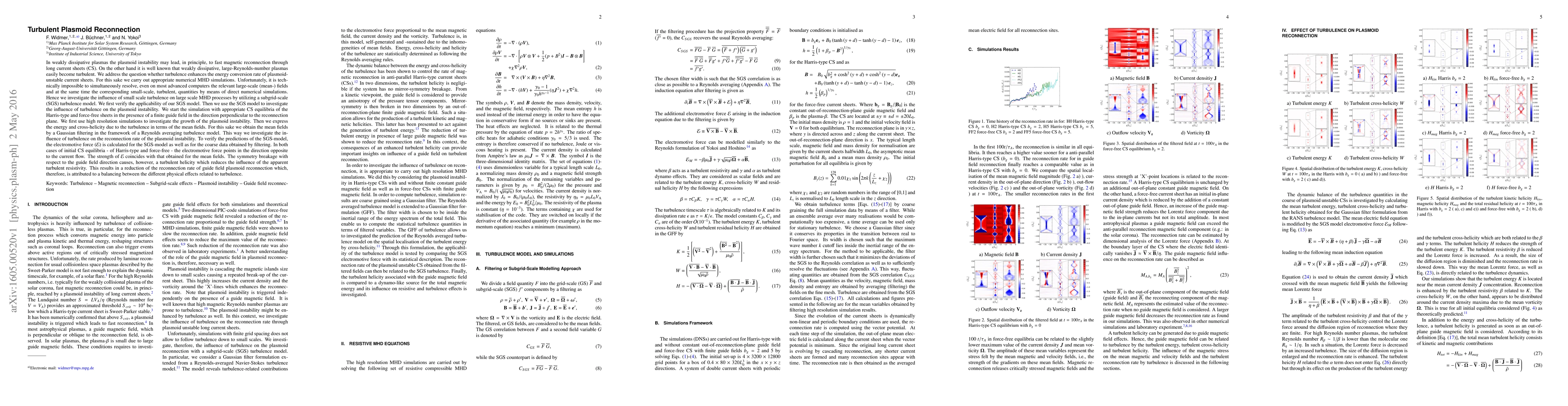 The plasmoid instability may lead to fast magnetic reconnection through long current sheets(CS). It is well known that large-Reynolds-number plasmas easily become turbulent. We address the question whether turbulence enhances the energy conversion rate of plasmoid-unstable current sheets. We carry out appropriate numerical MHD simulations, but resolving simultaneously the relevant large-scale (mean-) fields and the corresponding small-scale, turbulent, quantities by means of direct numerical simulations (DNS) is not possible. Hence we investigate the influence of small scale turbulence on large scale MHD processes by utilizing a subgrid-scale (SGS) turbulence model. We verify the applicability of our SGS model and then use it to investigate the influence of turbulence on the plasmoid instability. We start the simulations with Harris-type and force-free CS equilibria in the presence of a finite guide field in the direction perpendicular to the reconnection plane. We use the DNS results to investigate the growth of the plasmoid instability. The energy and cross-helicity due to turbulence are obtained in terms of the mean fields by a Gaussian filtering formulation from a Reynolds averaging turbulence model. The influence of turbulence on the reconnection rate of the plasmoid instability is investigated. To verify the predictions of the SGS-model, the electromotive force (${\bf\cal{E}}$) is calculated for the coarse data obtained by filtering and compared to the SGS-model. The symmetry breakage with respect to the guide field direction causes a turbulent helicity which reduces the influence of the apparent turbulent resistivity. The reduced reconnection rate of guide field plasmoid reconnection is attributed to a balancing between the different physical effects related to turbulence.